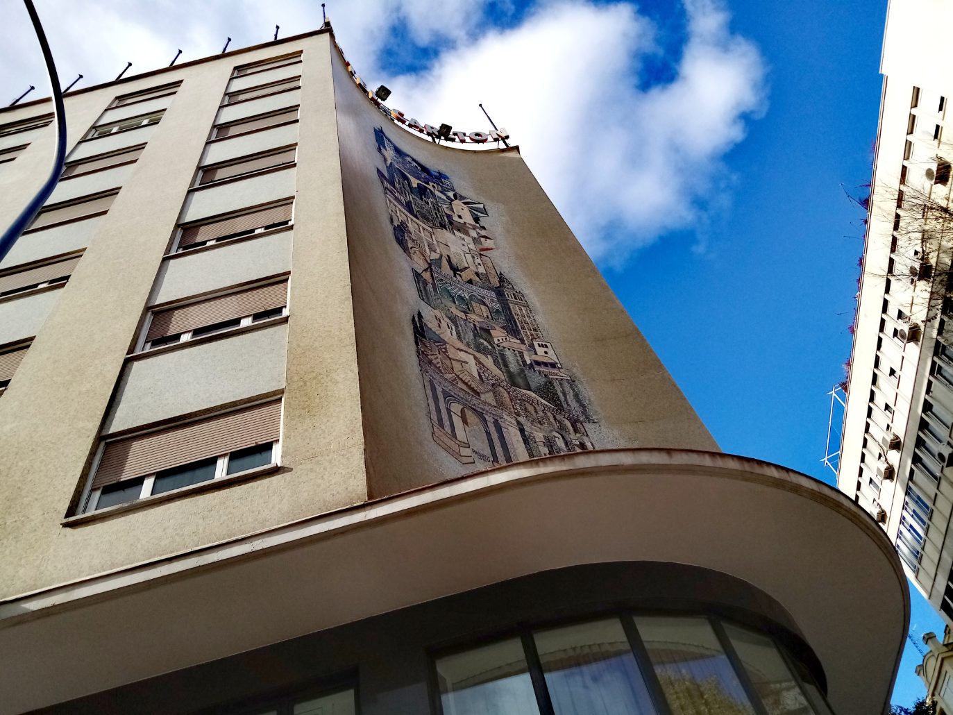 “Hotel Carlton ; Paseo de las Delicias, José Maria Garmán Zubizarreta, (1959); mosaico: Santiago Padrós”,