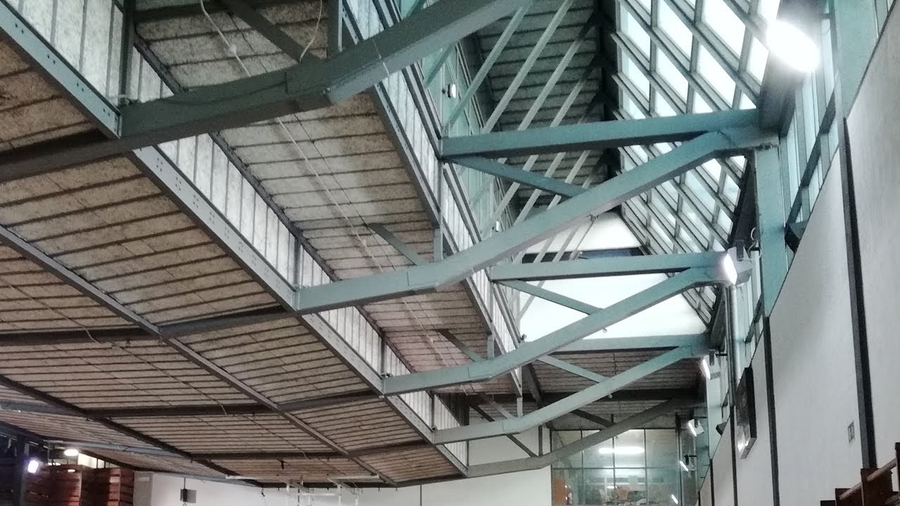 hormigón para los elementos sustantes, y una estructura metálica polivalente para el alojamiento de instalaciones,