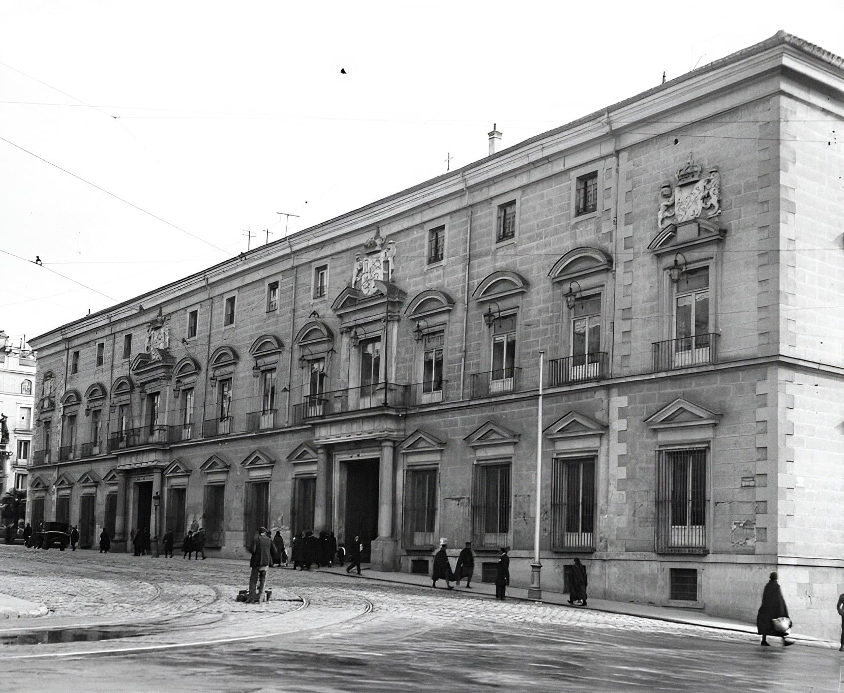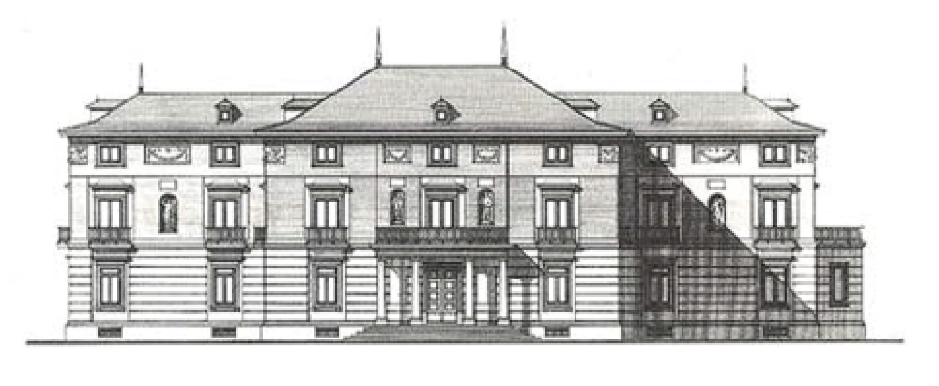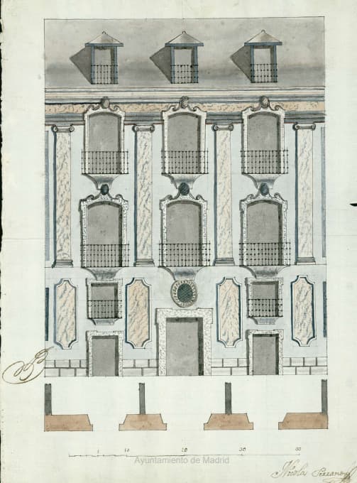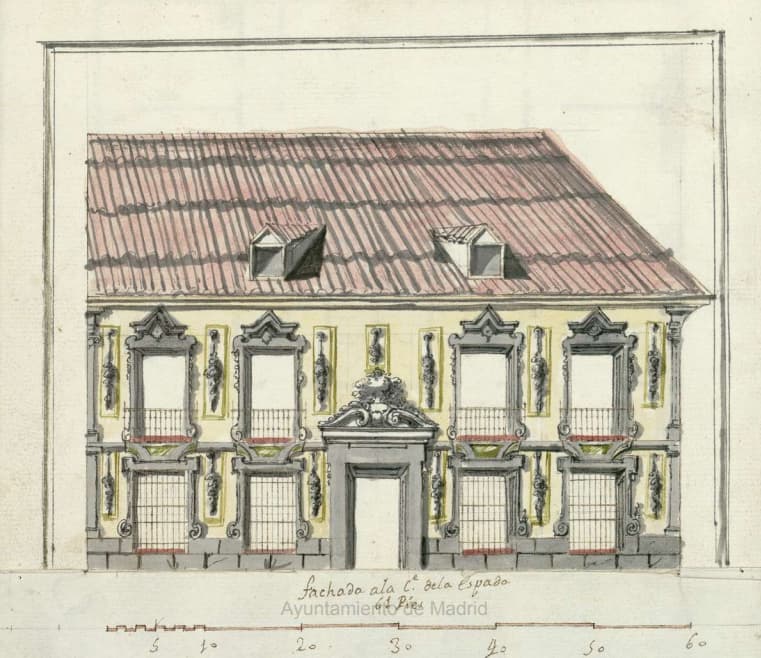 Hablando de Moncloa, en este antiguo alzado el palacio iba a ser más chato, con las guirnaldas más anchas. Y se echan de menos las esculturas que aparecen: