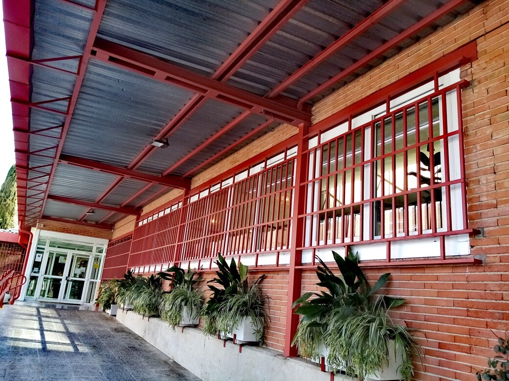 “camuflado entre edificaciones y vegetación, se alza esta agrupación de pabellones y naves diáfanas,