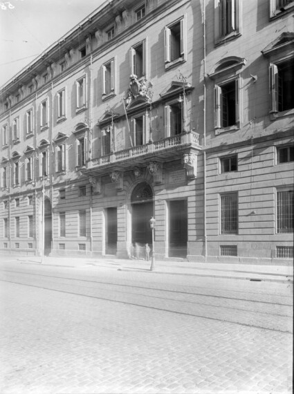 Nuestra noble y monumental Real Aduana, como corresponde a su soberbio diseño clasicista de Sabatini, tampoco veía enturbiada sus paramentos con un vulgar ladrillo. Además su revoco original era azul aguamarina, con lo cual, podemos imaginar como se vería la calle de Alcalá en ese tramo actualmente tan oscurecido, con ese color tan luminoso y tan propio del XVIII (color que también tenía la Real Casa de Correos en sus paramentos, otra vez, de ladrillo falso).