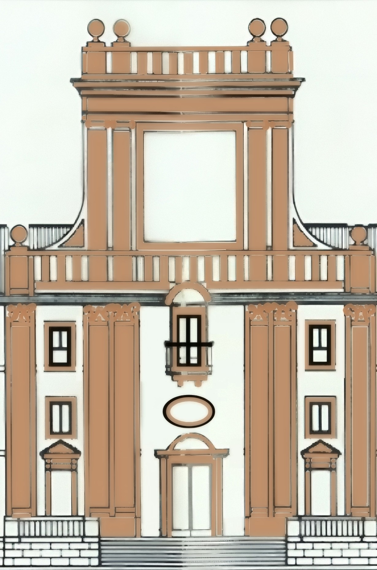 También pondría un ventanal elíptico entre la puerta principal y el balcón superior.