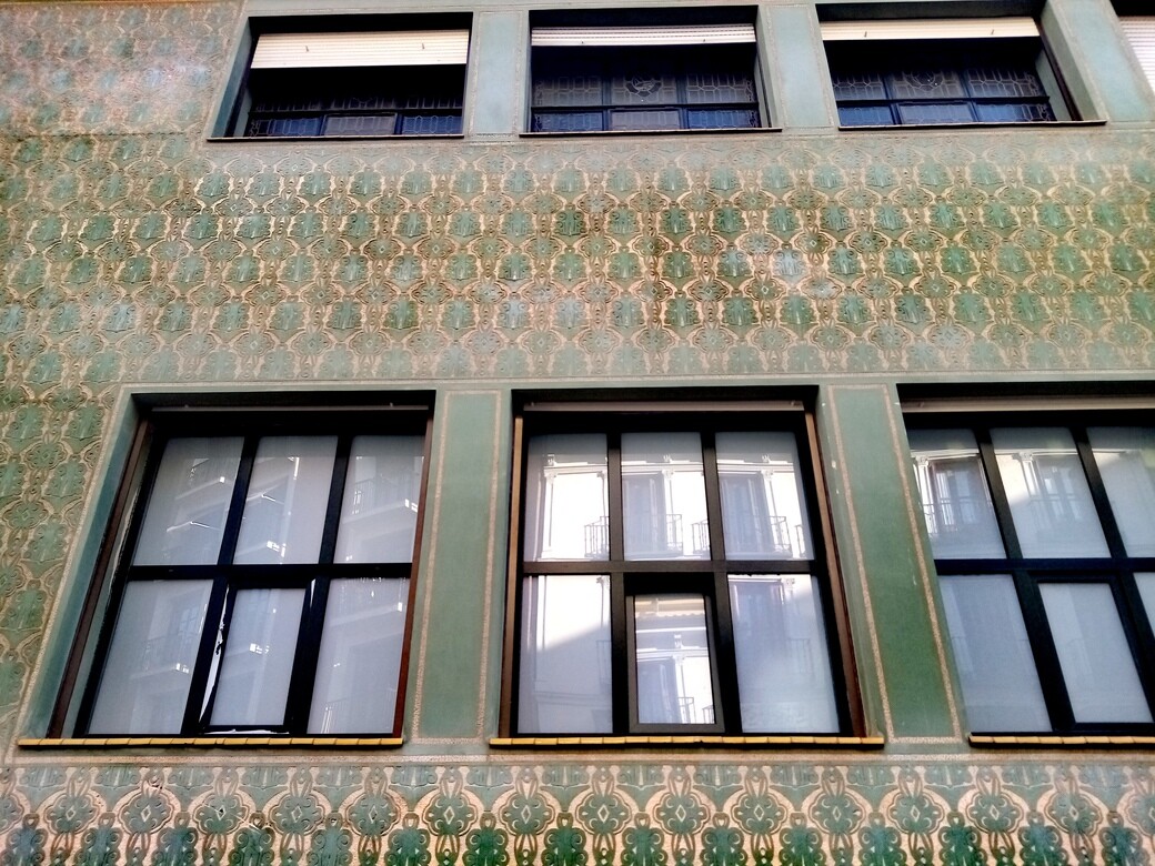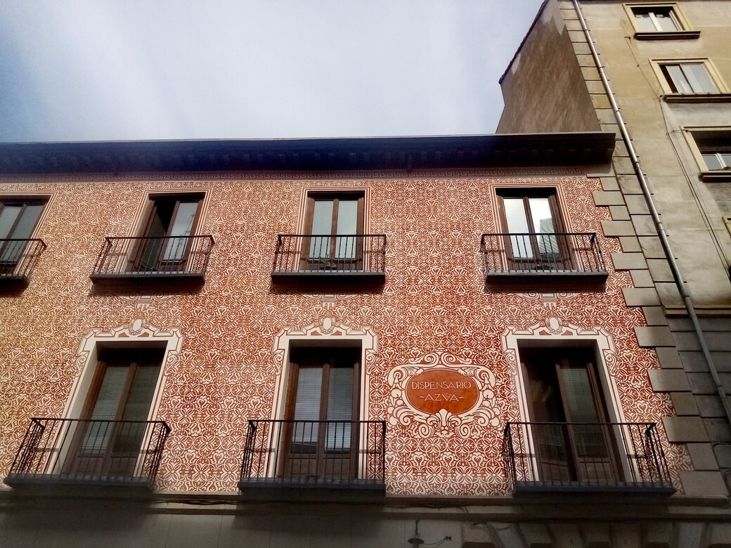 Siempre me ha llamado la atención que los dispensarios de sifilíticos de los años 20, (una enfermedad venérea bastante extendida en la época, Alfonso XIII se contagió) , sus fachadas hayan sido decoradas con estos bonitos esgrafiados barrocos de aires decó, y los interiores con paños cerámicos. Curiosa forma de adornar una fachada de un edificio dedicado a semejante curas.