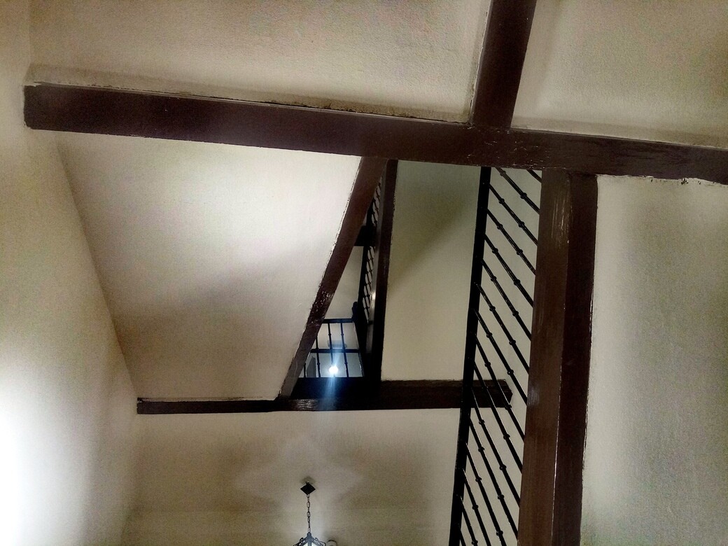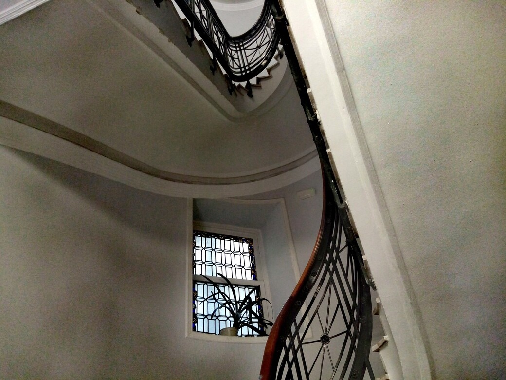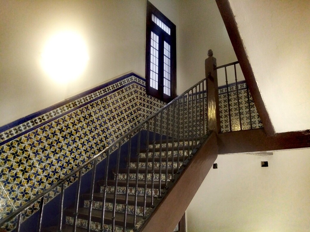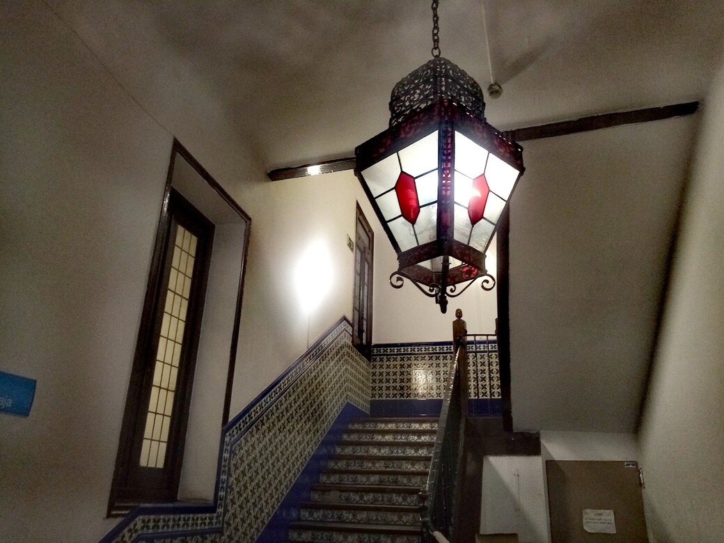 La verdad que la barandilla de madera y forja y las vigas de madera, son espectacularmente de caserón. Si alguien conoce la historia del edificio que lo cuente por favor. No he encontrado nada al respecto.