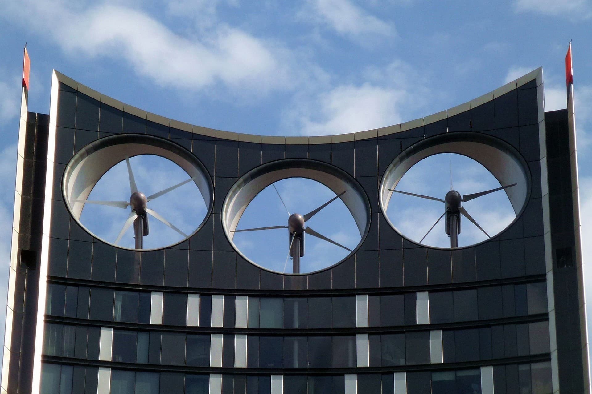 Cuando se diseñó la Torre Moeve (antes Torre Cepsa, antes Torre Repsol y en sus inicios Torre Caja Madrid) se pensó que el hueco del arco con sus formas aerodinámicas pudiera servir para alojar turbinas eólicas.