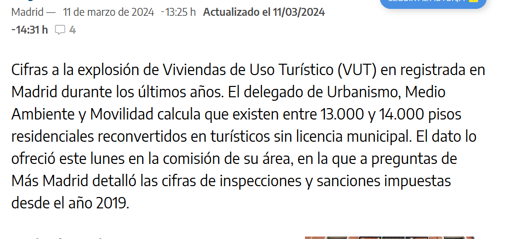 De hecho, sin tanta parafernalia, simplemente cotejando dos excels, por un lado el listado de los pisos legales del Ayuntamiento de Madrid y por otro, en el Portal de Datos Abiertos de la CAM, filtrando por VUT llegas a saber qué pisos concretos estan operando sin licencia municipal aunque pague sus tasas a la CAM. Así ya tienes a cientos de pisos a los que multar.