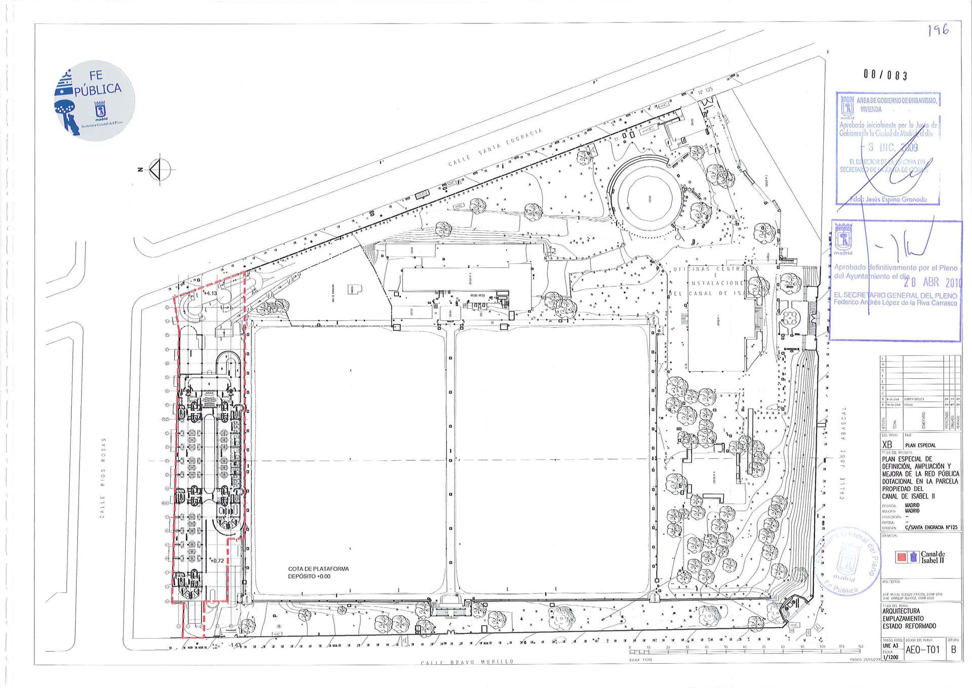Esa parcela, entre los edificios que hacen medianera y los depósitos del Canal, está catalogada con uso dotacional de infraestructuras (pertenece al CYII) y solo tiene permitida una altura de dos plantas, así que poco taparía lo que vemos ahora. Hay un plano en el que se ve un proyecto, sellado en 2009 de un edificio administrativo del CYII con testeros semicirculares y de dos alturas´