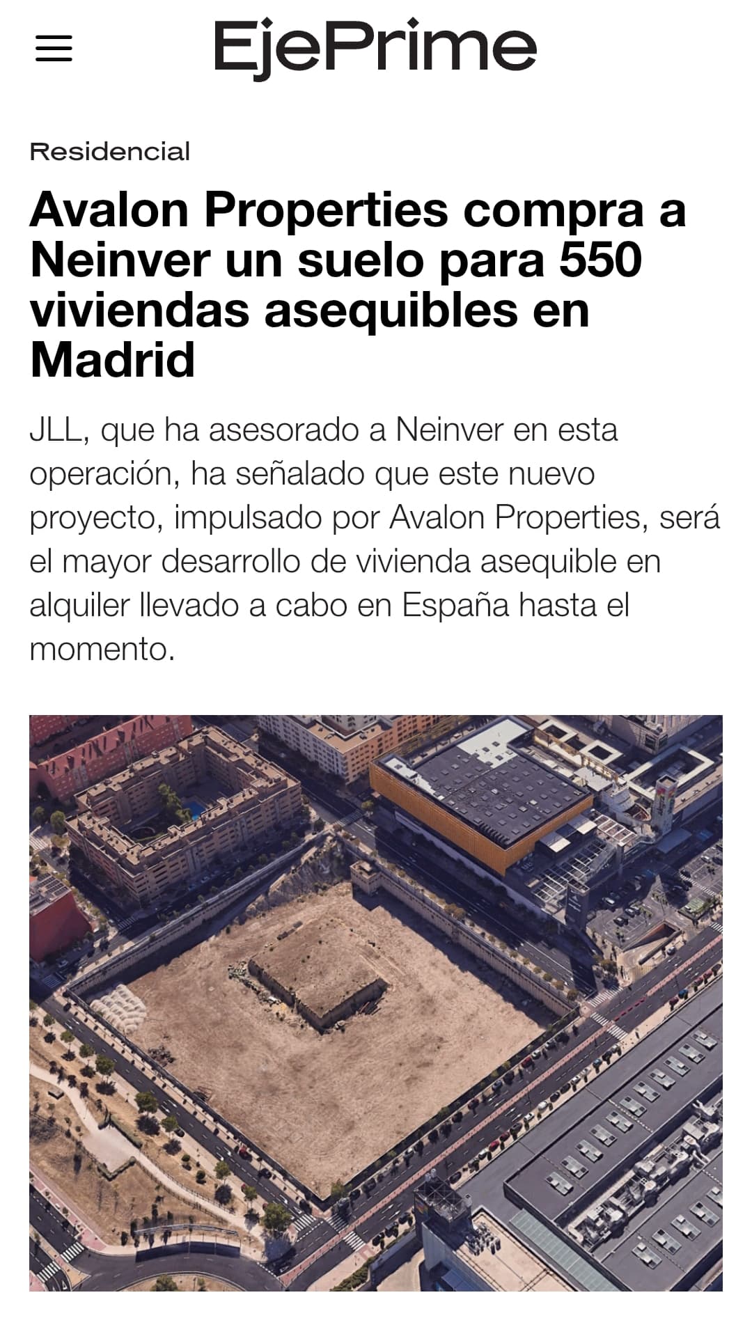 “En esta parcela, con una edificabilidad superior a 34.000 metros cuadrados, se desarrollarán más de 550 viviendas en régimen de Vivienda de Protección Pública de Precio Limitado (Vppl). El proyecto, impulsado por Avalon Properties, será el mayor desarrollo de vivienda asequible en alquiler llevado a cabo en España hasta la fecha, ha informado JLL, consultora que ha asesorado a Neinver en esta operación.