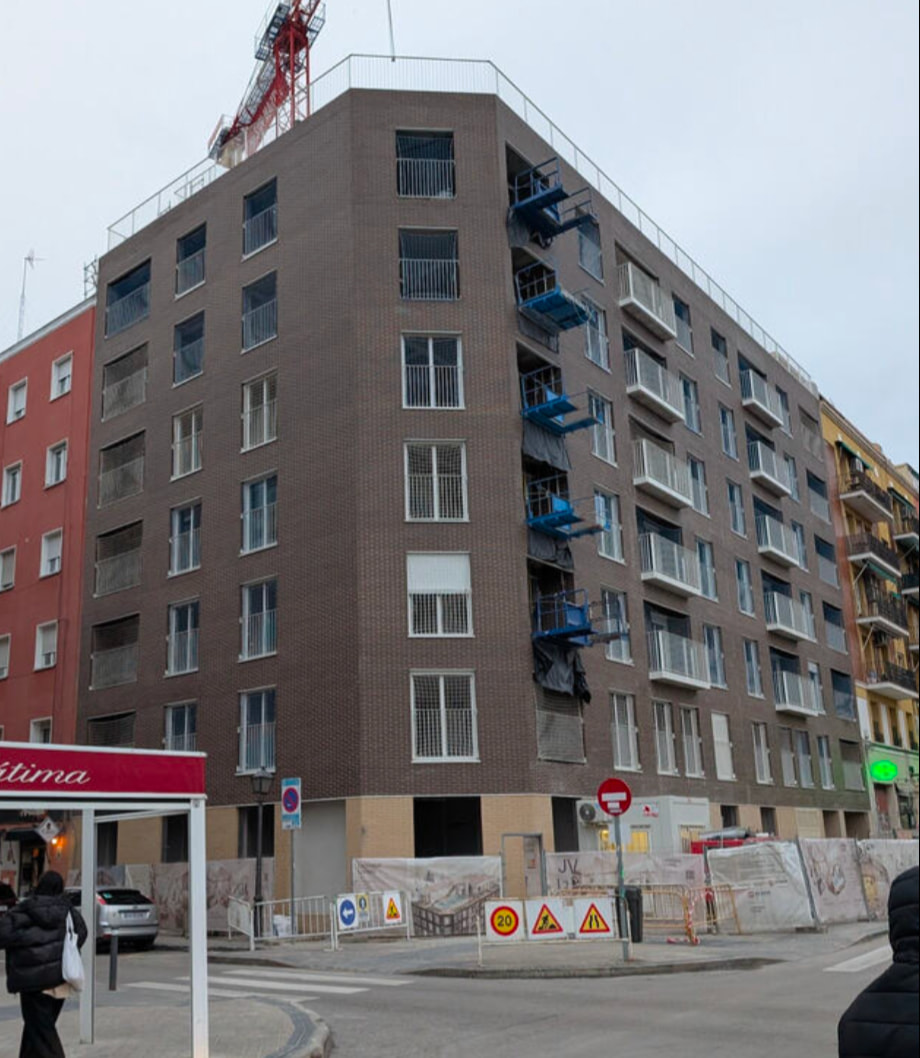 Y el edificio en obras tiene más diferencias que los cercos, el interior de las terrazas es blanco en los renders, y el ladrillo llega hasta el suelo con unas estrias en el bajo, y en la realidad han cambiado de color todo el bajo.