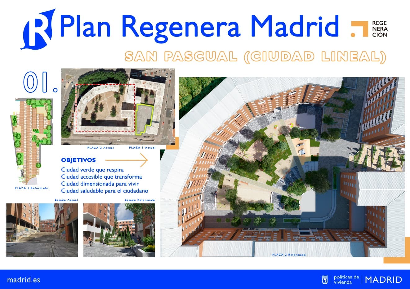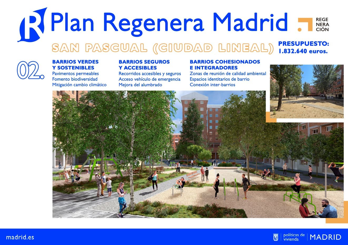 Estas intervenciones forman parte del Plan Regenera Madrid, una iniciativa de gran escala que intervendrá sobre más de 85 km² de superficie de la ciudad construida antes de 1985, beneficiando al 75 % de la población madrileña. El plan ha comenzado con actuaciones en 14 distritos, entre ellos Ciudad Lineal, incidiendo especialmente en los espacios interbloques, que representan más de un tercio del suelo residencial de la capital, y en los que el Ayuntamiento no podía actuar. En fases posteriores, llegará al conjunto de los 21 distritos.
