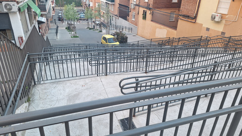 La cosa es que me he quedado pensando cuánta infraestructura como esta hay en Madrid, una ciudad bastante grande y con una orografía complicada, y solo se me han ocurrido, aparte de este último, los ascensores de la reformada Plaza de España y dos en Tetuán, creo. Si conocéis algún otro comentadlo, porque no conozco más. Y estas actuaciones, que son tan comunes en otras ciudades del norte de España o Lisboa, mismamente, aquí se nos atragantan. Lo más común es encontrarte con este tipo de reformas de ‘accesibilidad’: