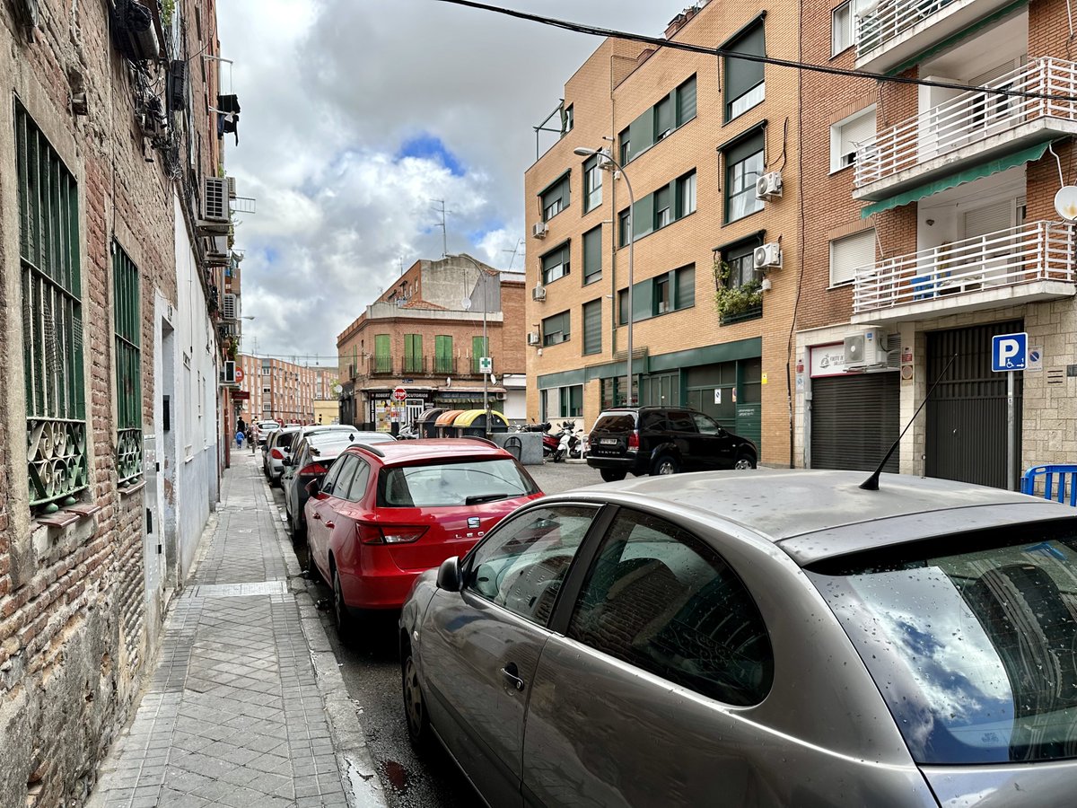 La solución en barrios y calles así, es cambiar los edificios antiguos de 2-3 plantas por edificios modernos de 5-8 plantas, retranqueados y con 2 plazas de garaje por vivienda. Y así con el tiempo la calle puede hacerse más ancha, con aceras más anchas con árboles y eliminar la mayoría del aparcamiento en superficie.