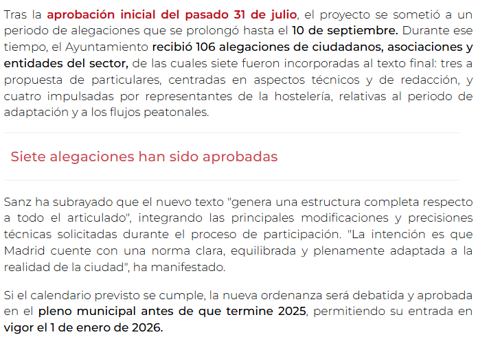 Tras la aprobación inicial del pasado 31 de julio, el proyecto se sometió a un periodo de alegaciones que se prolongó hasta el 10 de septiembre. Durante ese tiempo, el Ayuntamiento recibió 106 alegaciones de ciudadanos, asociaciones y entidades del sector, de las cuales siete fueron incorporadas al texto final: tres a propuesta de particulares, centradas en aspectos técnicos y de redacción, y cuatro impulsadas por representantes de la hostelería, relativas al periodo de adaptación y a los flujos peatonales.