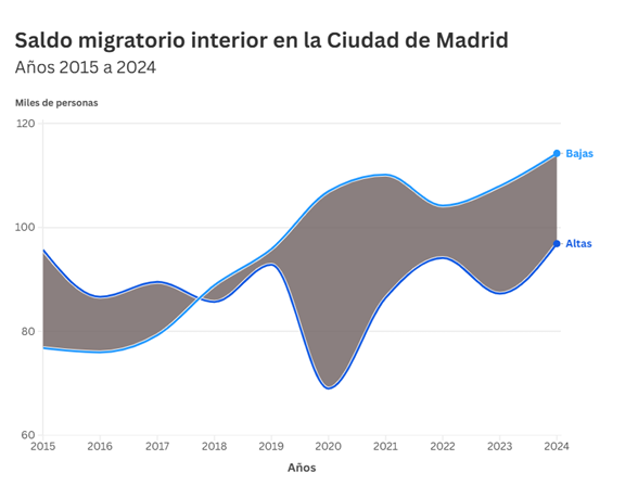 Durante el año 2024, más de 114.000 personas trasladaron su residencia a otros municipios españoles desde Madrid. La mayor parte de estos movimientos se produjeron a otros municipios de la Comunidad de Madrid, y hacia las provincias de Toledo, Barcelona, Valencia, Alicante y Guadalajara.