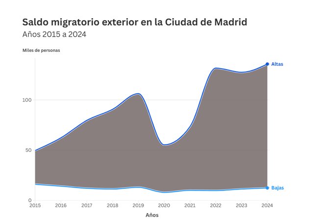 A lo largo del año 2024 se produjeron cerca de 136.000 altas procedentes del extranjero, máximo de la serie, consolidando a la Ciudad de Madrid como destino residencial preferente. Las entradas desde Venezuela, Colombia, Perú, Ecuador y Argentina suponen casi la mitad de dichos movimientos.