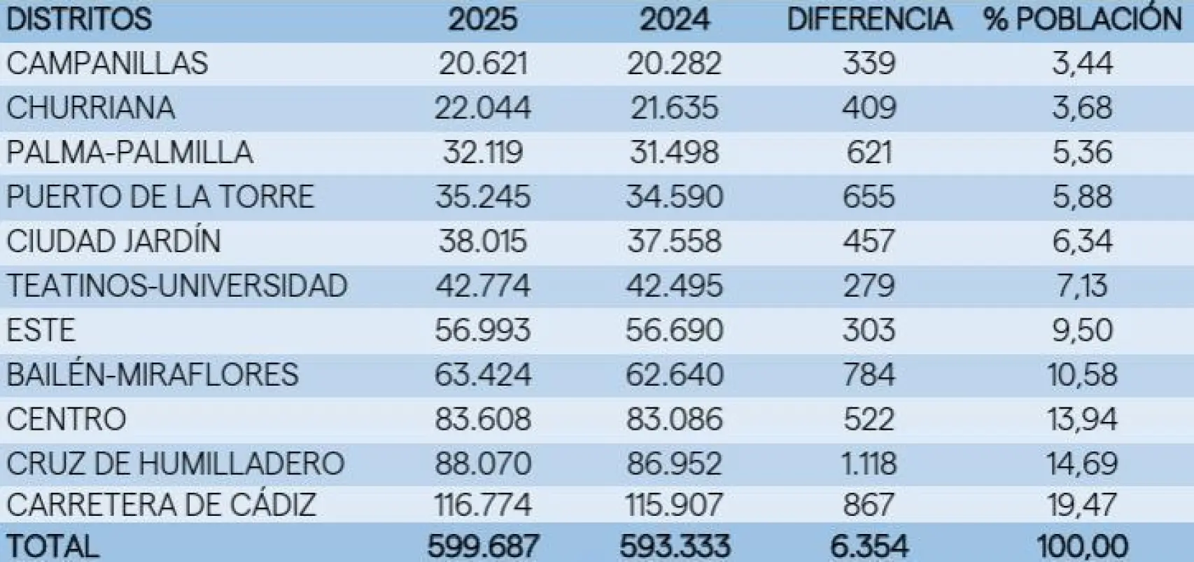 La población se vuelve a disparar, con subidas en todos los distritos, y sitúa a Málaga capital al borde de la liga de las ciudades del rango de 600.000-700.000 habitantes, junto a Sevilla y Zaragoza.