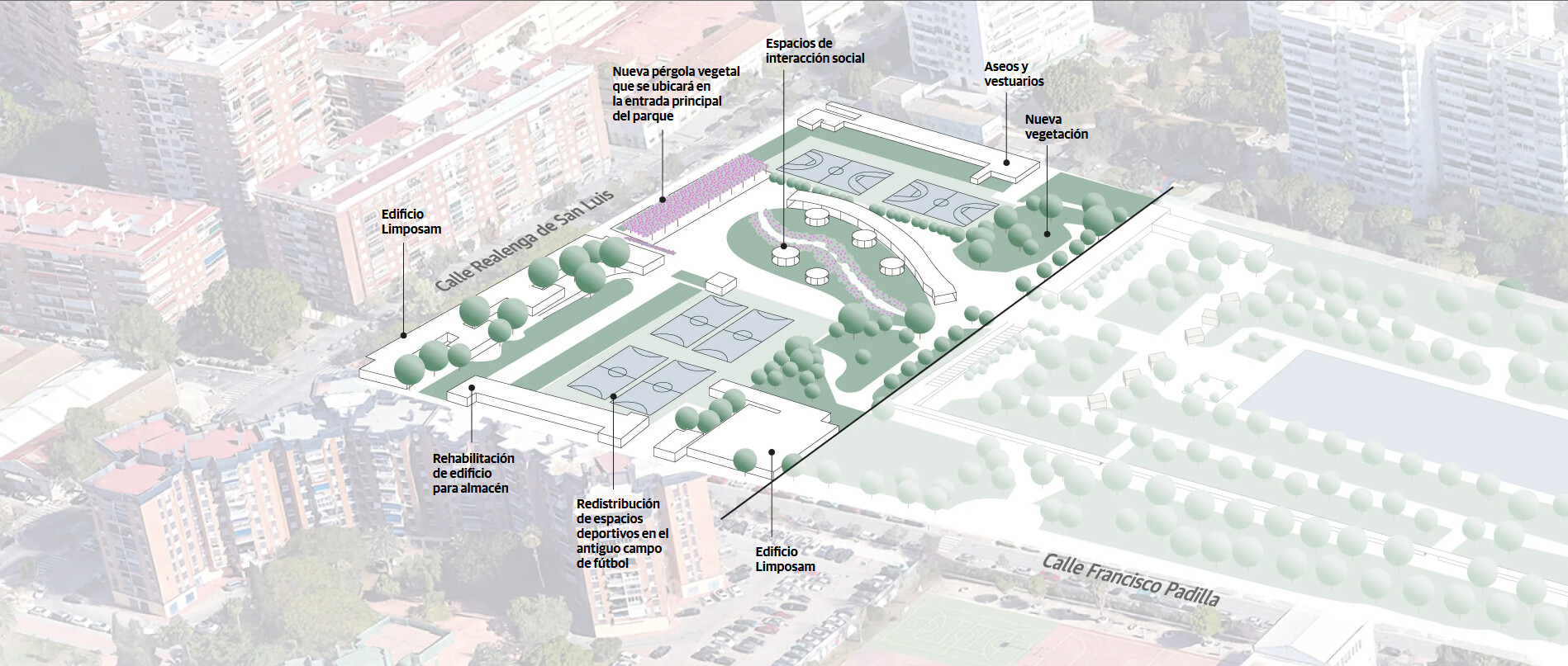 La primera parte de la actuación abarca la zona norte del parque, la más próxima a la calle Realenga de San Luis. Sobre el edificio que actualmente alberga varios locales comerciales se plantea la realización de una construcción superpuesta, a modo de primera planta, para acoger la sede de la empresa municipal Limposam, actualmente ubicada en el camino de San Rafael pero que tiene su origen en el Parque del Oeste, ya que fue creada para mantener este espacio, si bien luego amplió sus servicios a la limpieza de colegios y otros edificios del Ayuntamiento. Eduardo Rojas propone junto a esa ampliación una zona de aparcamientos en superficie para los usuarios de las oficinas, cubierta con una pérgola vegetal que las integre en el parque.