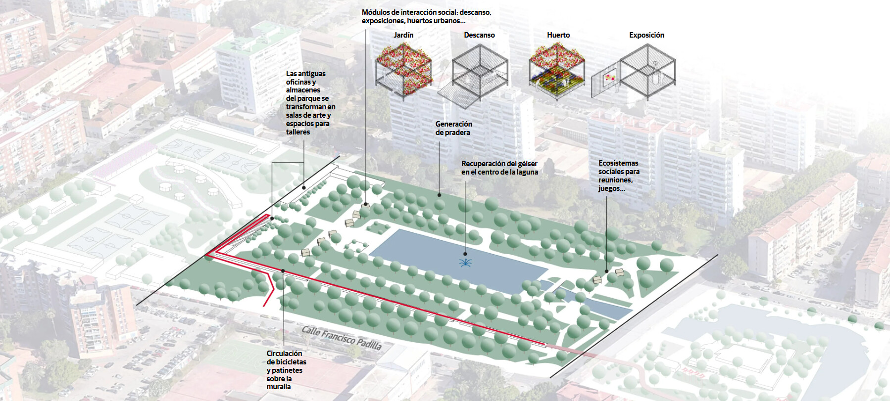 No obstante, una de las propuestas más llamativas para esta zona es la realización de una especie de cubículos intercalados entre las zonas verdes que Eduardo Rojas ha ideado como «módulos de interacción social» y que podrían albergar usos tan dispares como una pequeña biblioteca, una sala de lactancia, juegos de música, espacios infantiles o espacios de apoyo a las familias que se lleven comida para degustarla en las mesas y sillas que se van a habilitar en la zona.