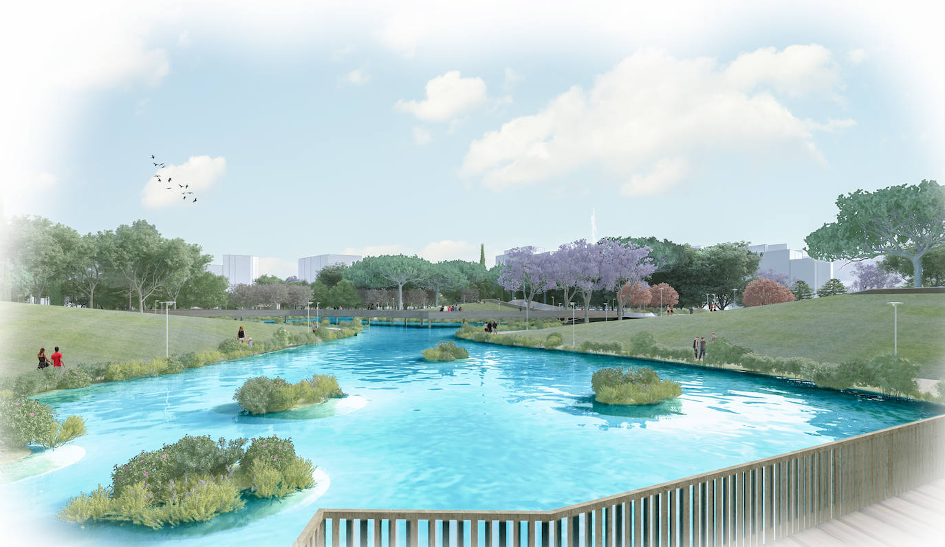 El futuro parque estará centrado por un lago de 3.500 metros cuadrados, cruzado por dos puentes de madera, y enmarcado por tres colinas dotadas de césped para tomar el sol y pasear. Además, habrá dos parques caninos en la zona más próxima a la avenida de Juan XXIII para perros grandes (3.500 metros cuadrados) y perros pequeños (2.500 metros cuadrados), y otras dos zonas para juegos infantiles, diferenciadas igualmente para menores de mayor o menor edad.