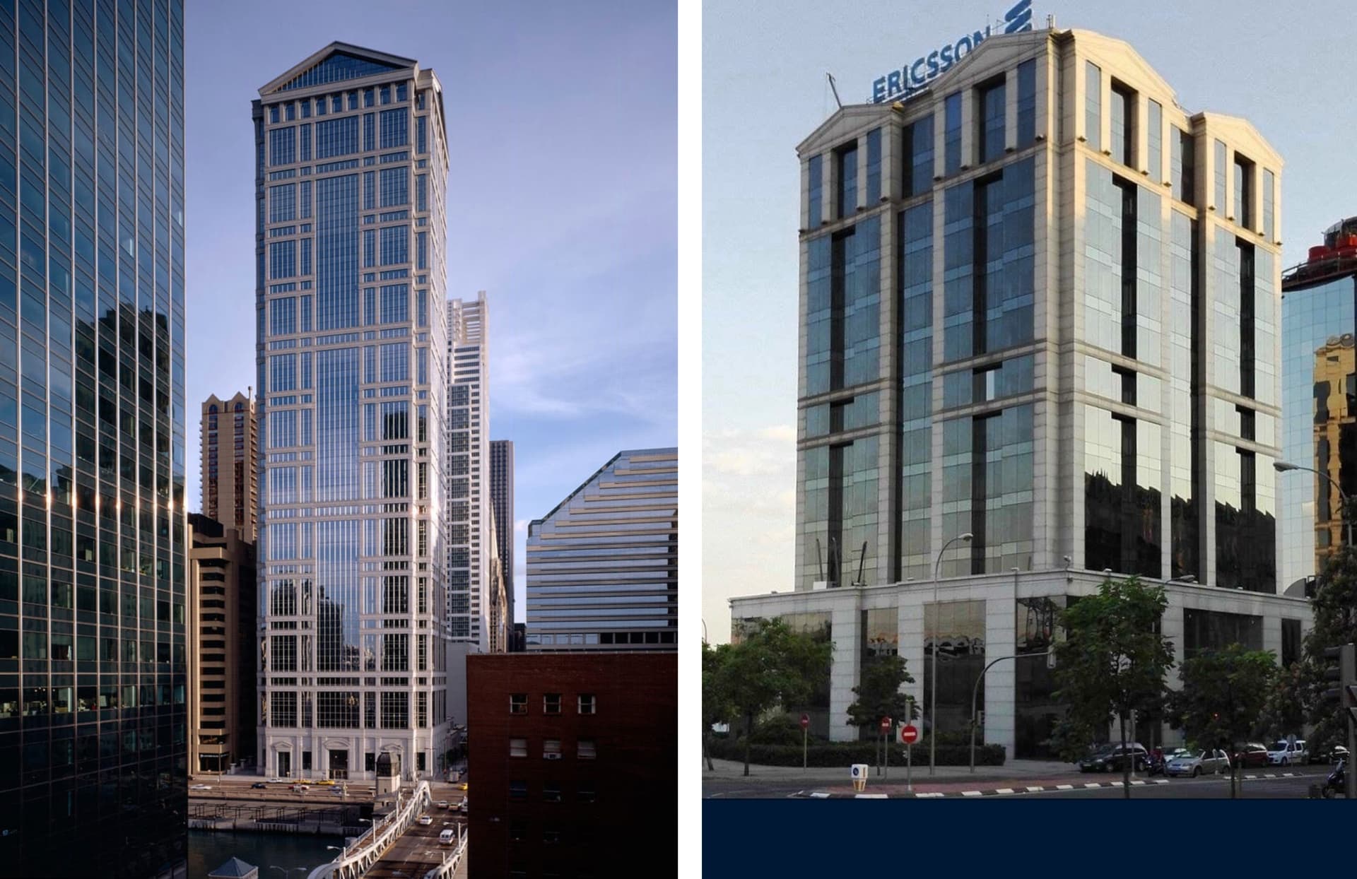 Yo creo que la torre de Bofill es un poco torpe, no es solo el empleo de un léxico que ya estaba agotado, es que la combinación de los distintos elementos chirría. En vez de un frontón por fachada tenemos dos. Las lajas de piedra situadas bajo el frontón de Chicago es un comentario depurado (ya bastante trillado) al juego clásico de triglifos y metopas. En Madrid parece que el edificio está coronado en cada una de sus fachadas por dos escenografías de templos griegos, que recuerdan a la fachada de un salón de bodas de extrarradio de los noventa.