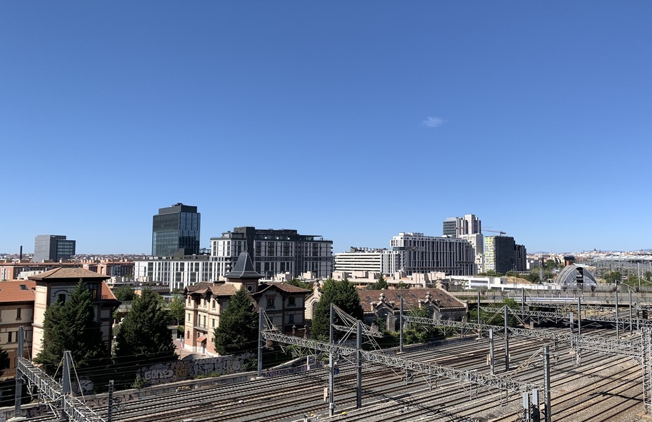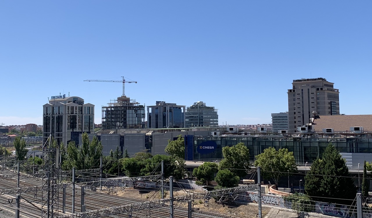 Vistas desde Adelfas. Avanzan los bloques con fachada a las vías y la nave misteriosa que ha renacido con otra forma. Por el sur, también avanza la reforma de la torre en calle Retama