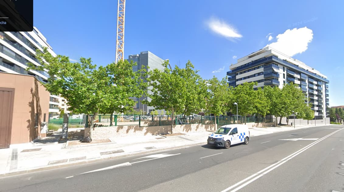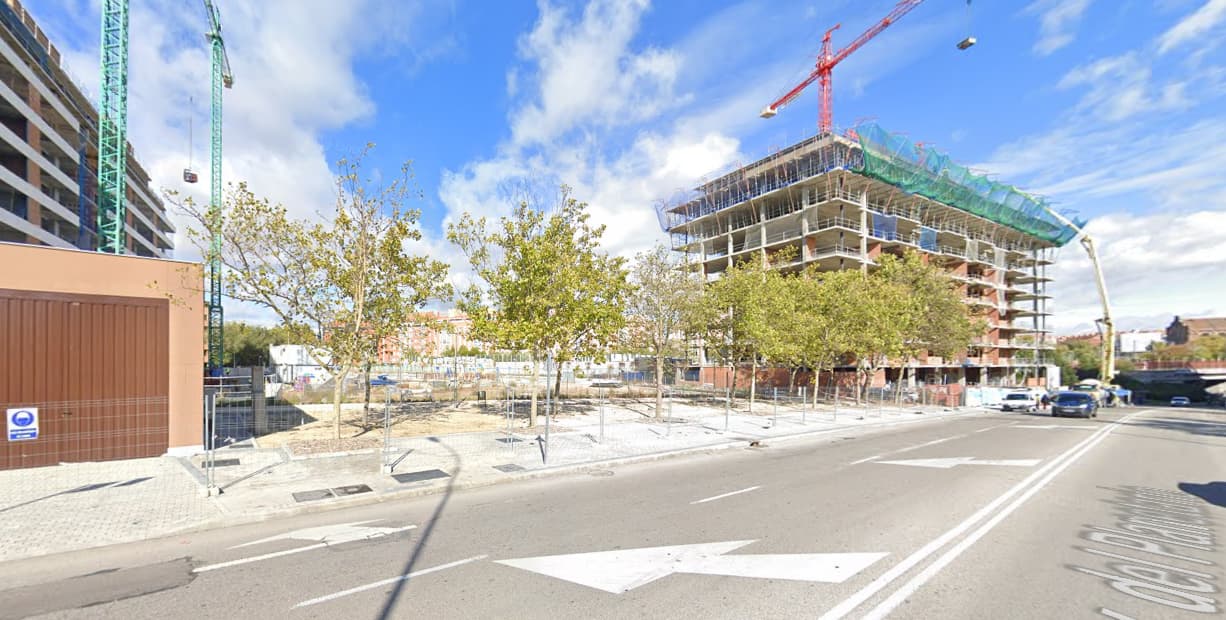 Hasta aquí todo OK (obviando la estética del edificio, que eso es otro tema). Lo que me parece un abuso, es que el año pasado se han “apropiado” del pequeño jardín con árboles al lado mediante un muro de bloques y vallado superior, y lo utilizan para aparcar maquinaria tipo dumpers y otros vehículos esquivando los árboles, pasando de esto: