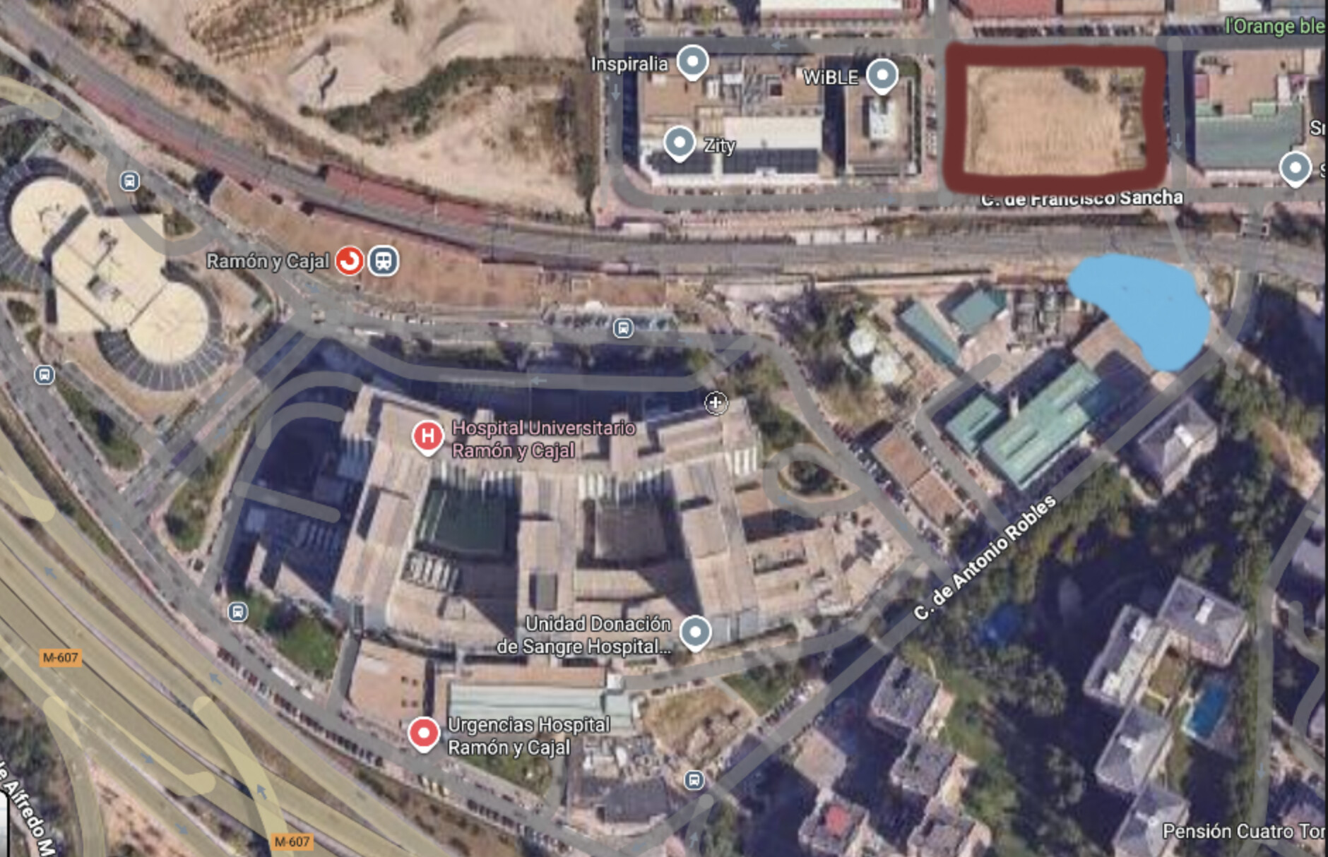 En rojo podría ir una estación de Metro (es un solar que lleva abandonado más de 30 años, y en Azul es la obra de reforma de nuevo acceso de Ramón y Cajal actual. Al lado se está haciendo el Oria Campus con un rascacielos pendiente.