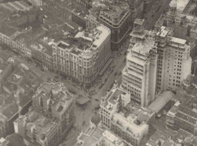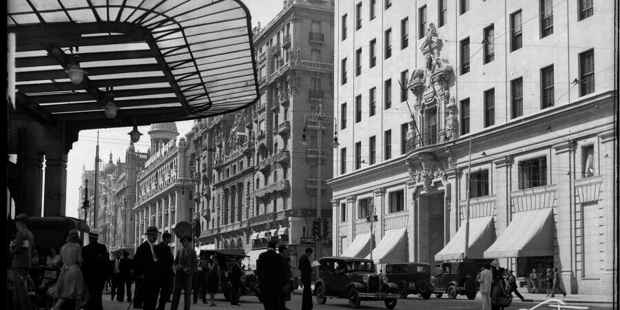 Pero el templete NO sobresalía de la linea de fachadas. No era un obstáculo para peatones (sí lo era el tráfico de coches y tranvías que había en Red de San Luis). Es un efecto óptico de la toma de la foto, por el escorzo que tiene el templete respecto a Gran Vía.