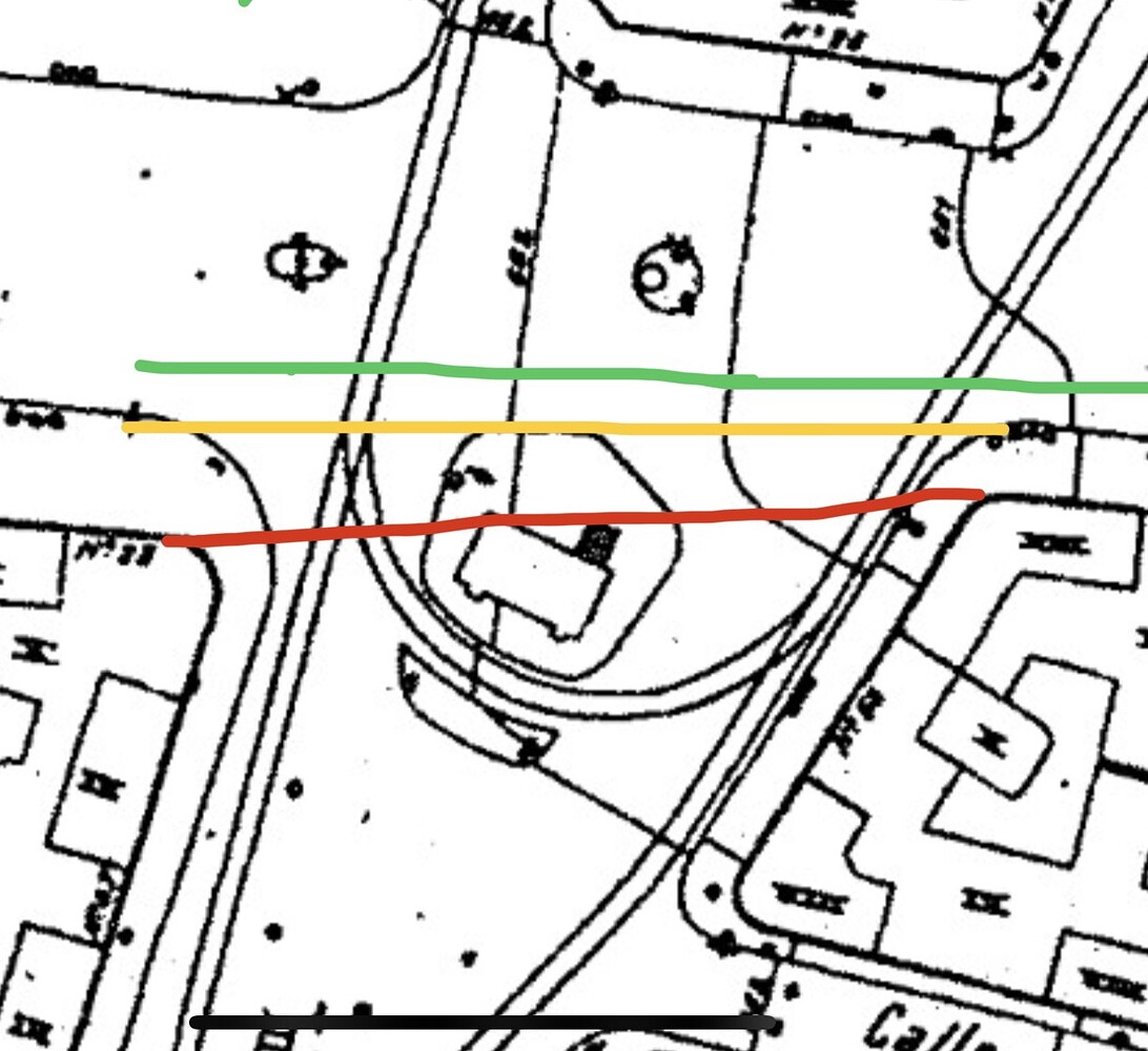 Un plano con el templete del metro en su ubicación antigua con la linea de la acera antigua y dibujada por mi, la nueva acera aproximada.
