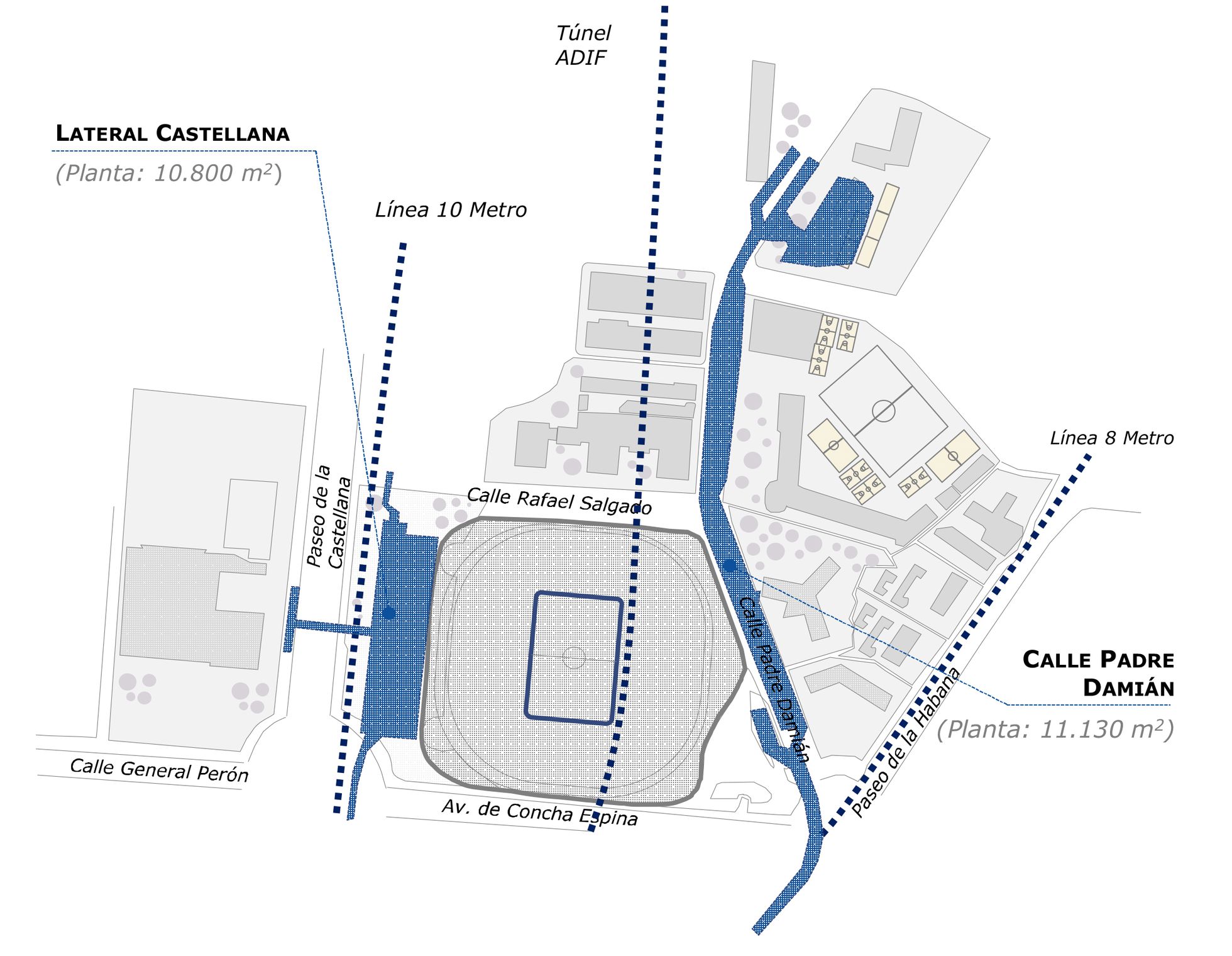 La verdad es que sería una oportunidad estupenda aprovechar con las obras de los parkings para hacer la estación de la línea 8 allí y llamarla Santiago Bernabéu (Este). Y la actual renombrarla a Santiago Bernabéu (Oeste).