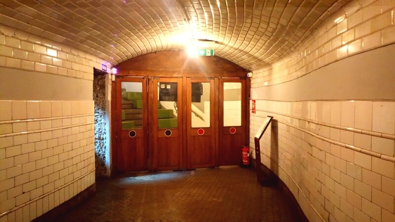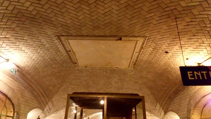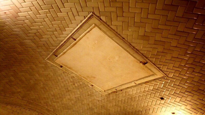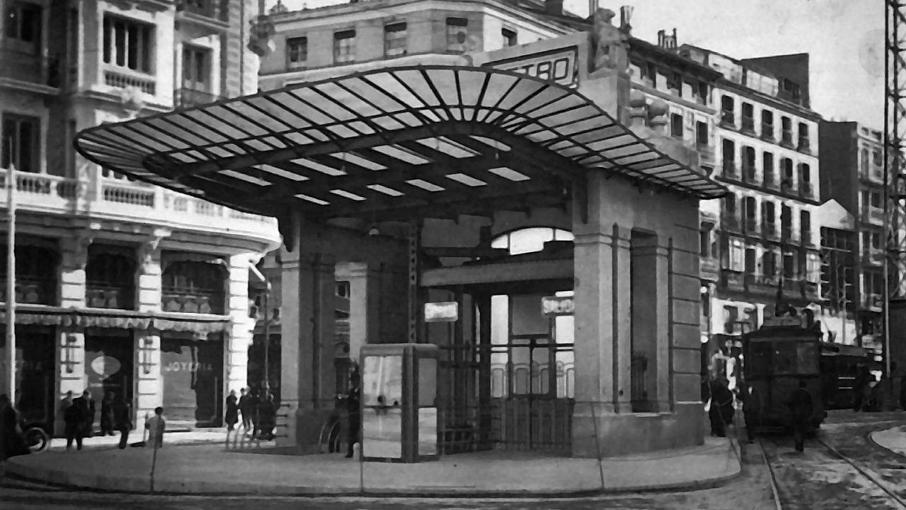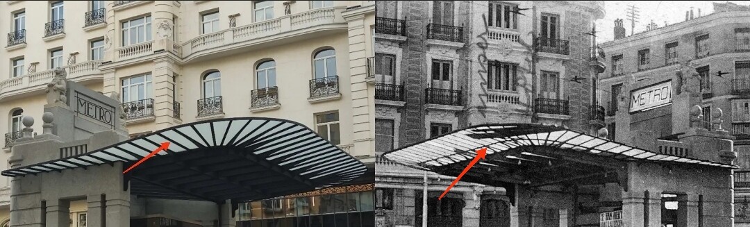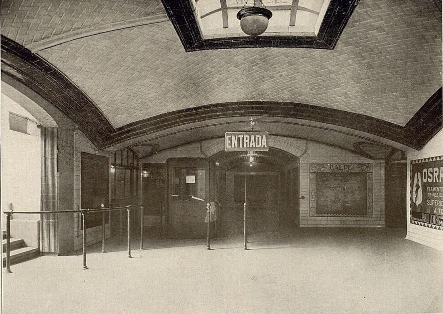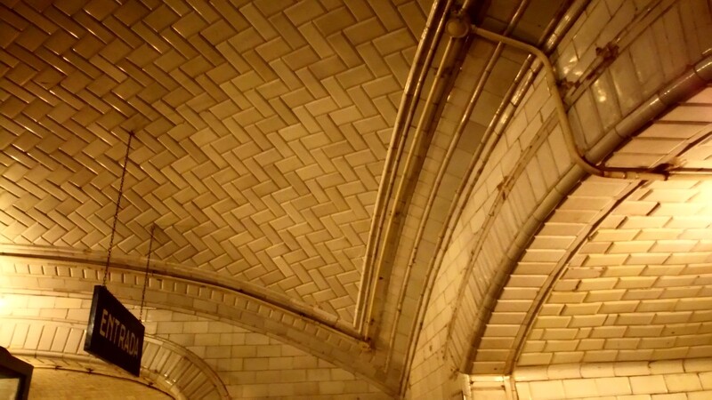 llegamos a la entrada del metro, donde Palacios abovedò el techo, con azulejo en “raspa de pez” y lucernario, que servía para iluminar y quitar la sensación que tenías de estar bajo tierra, (hoy tapado),