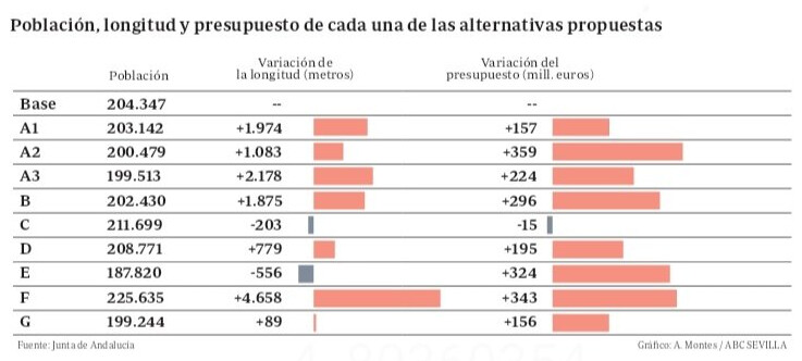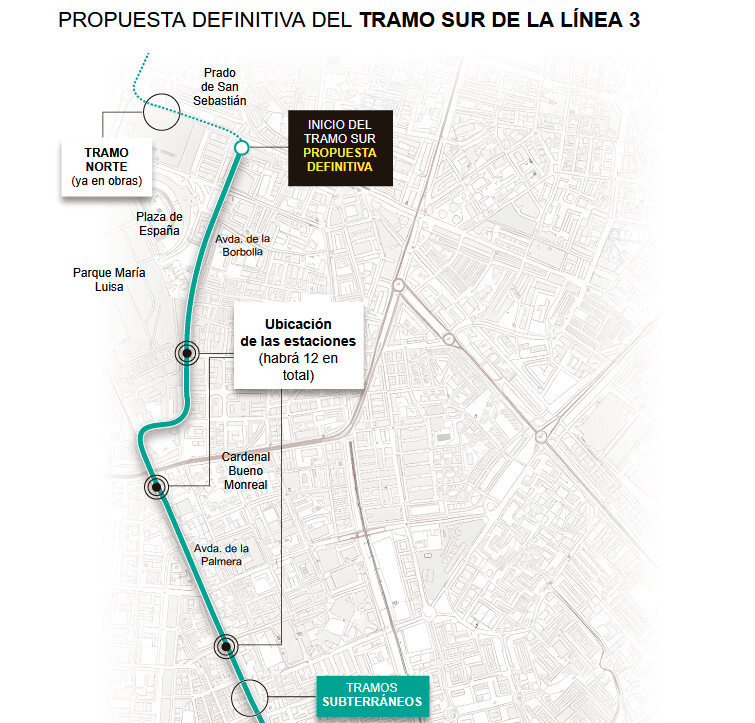 Segunda línea de metro de la capital de Andalucía, construida por episodios (tramo norte y luego tramo sur) para la que habrá que esperar hasta 2040 como pronto y encima la convierten en tranvía en zonas plenamente urbanas.