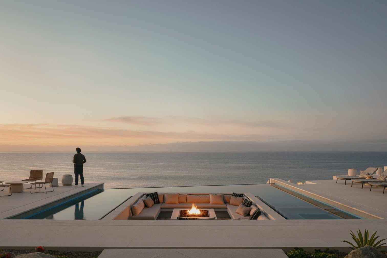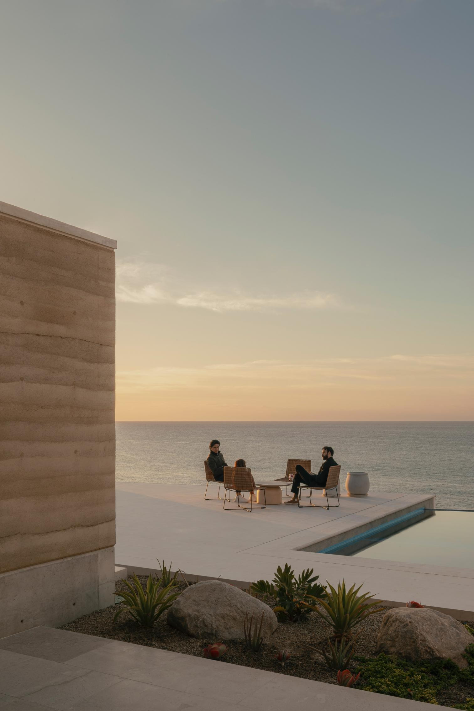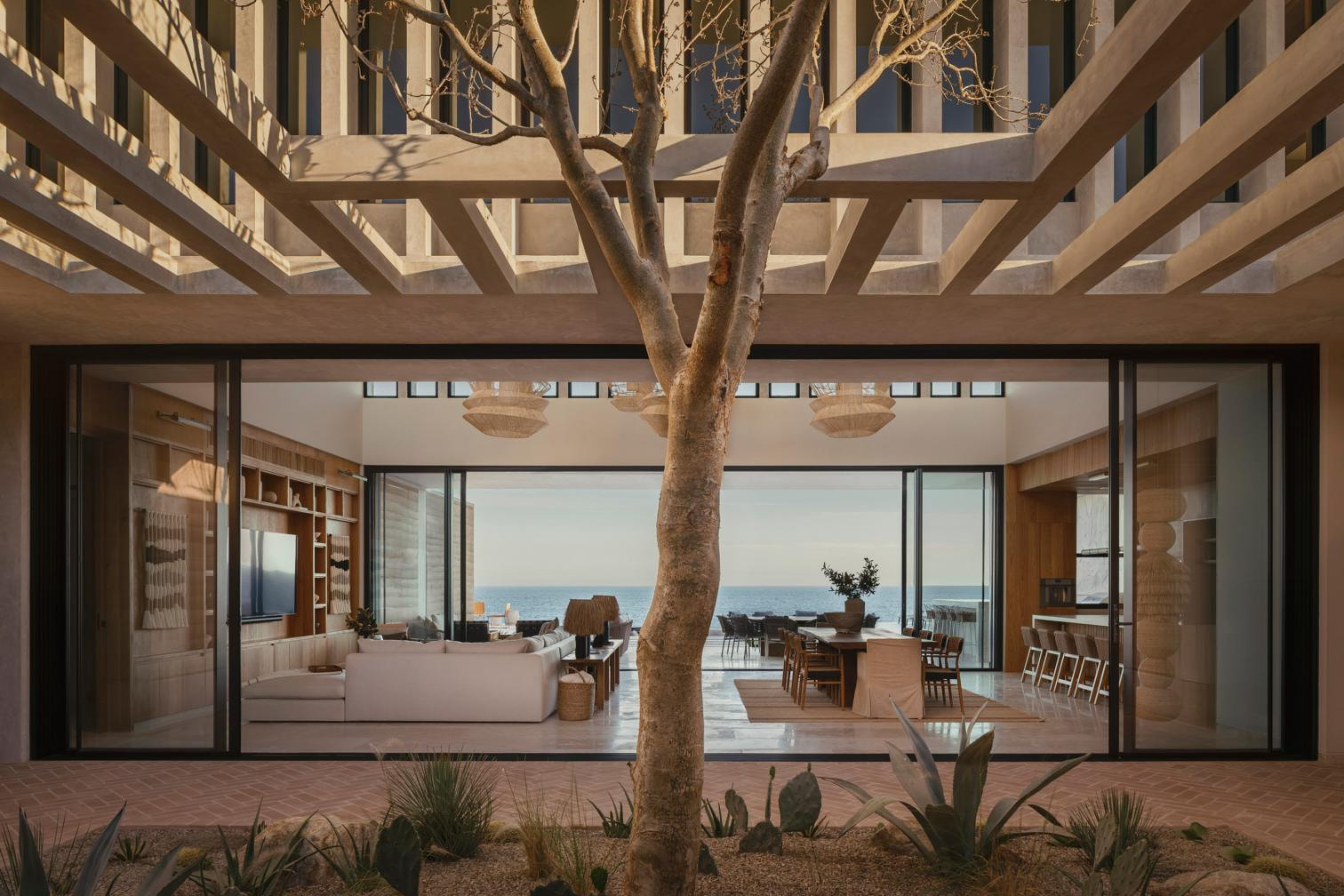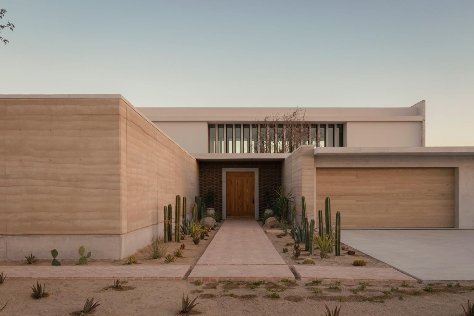 Ubicada en el paisaje privilegiado de Cabo del Este, en Baja California Sur, la casa responde de manera sensible a su entorno natural, protegiéndose de los vientos predominantes sin renunciar a las vistas abiertas hacia el mar. El acceso se plantea como una secuencia de transición gradual. Un muro ciego marca el frente hacia la calle y garantiza la privacidad, dejando visibles únicamente los accesos peatonal y vehicular. A partir de este punto, los muros de tierra compactada del volumen principal conducen al visitante hacia la entrada, culminando en un muro de ladrillo que enmarca una puerta monumental de roble. Este recorrido desemboca en el patio central, elemento organizador y corazón del proyecto.
