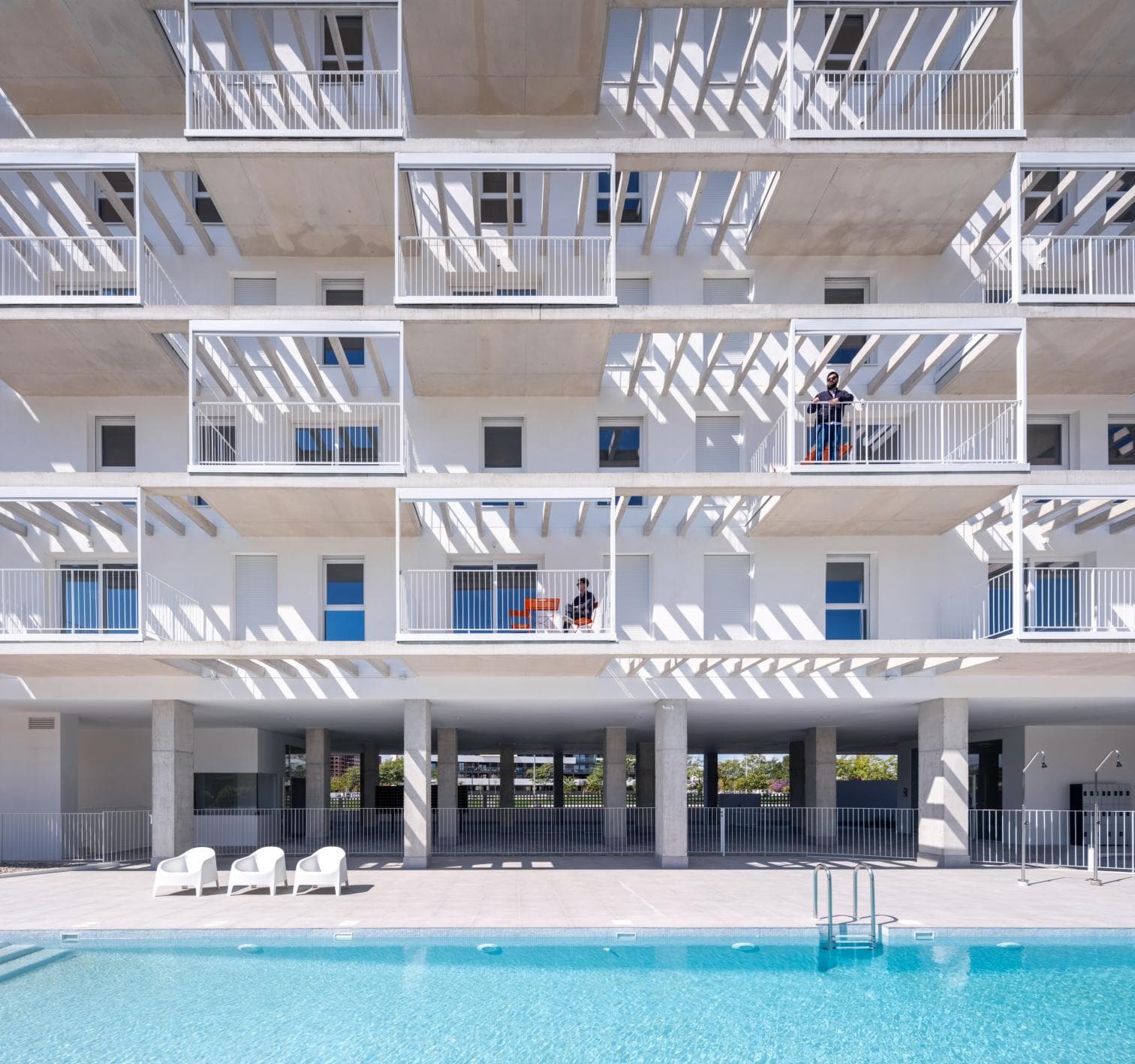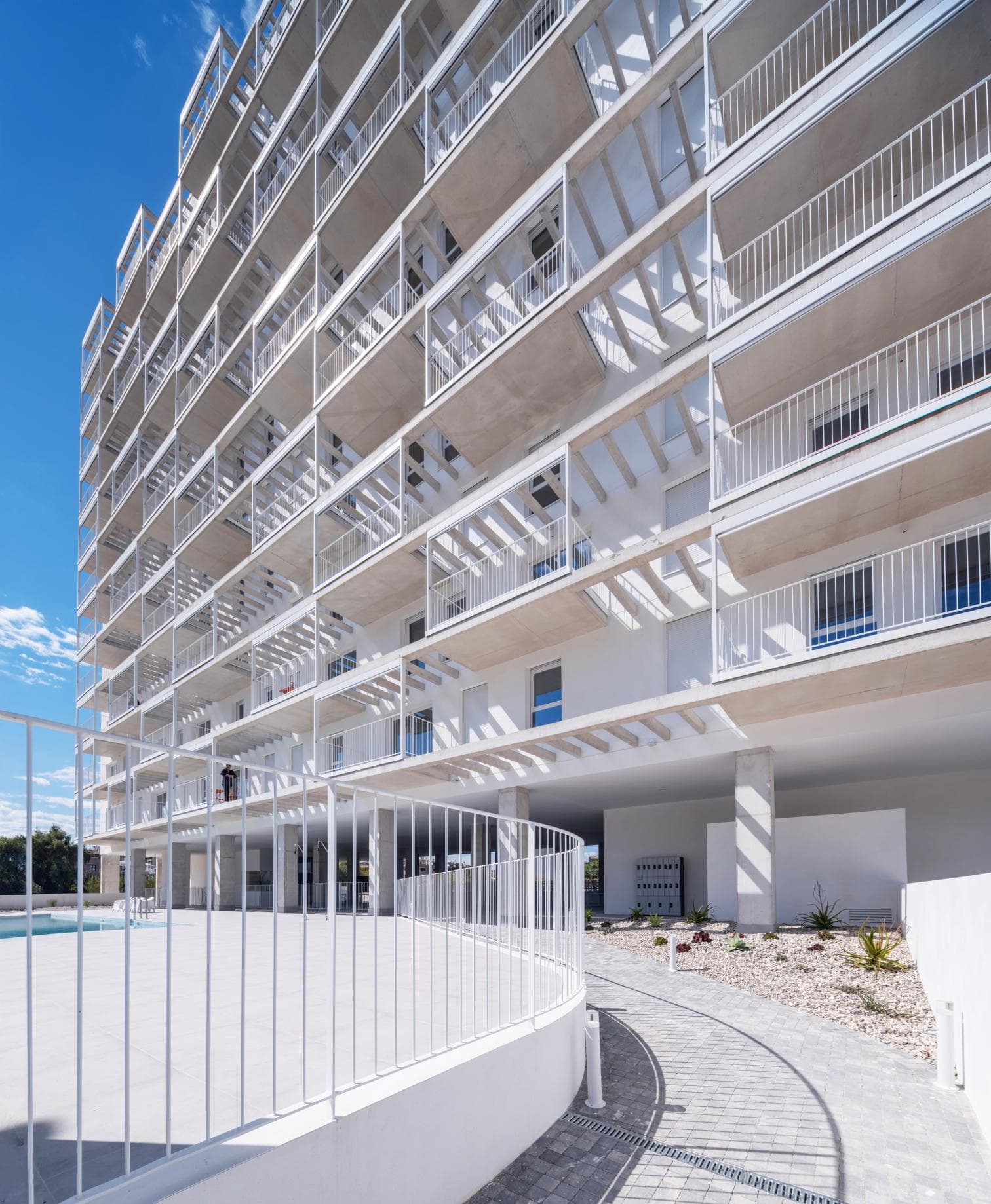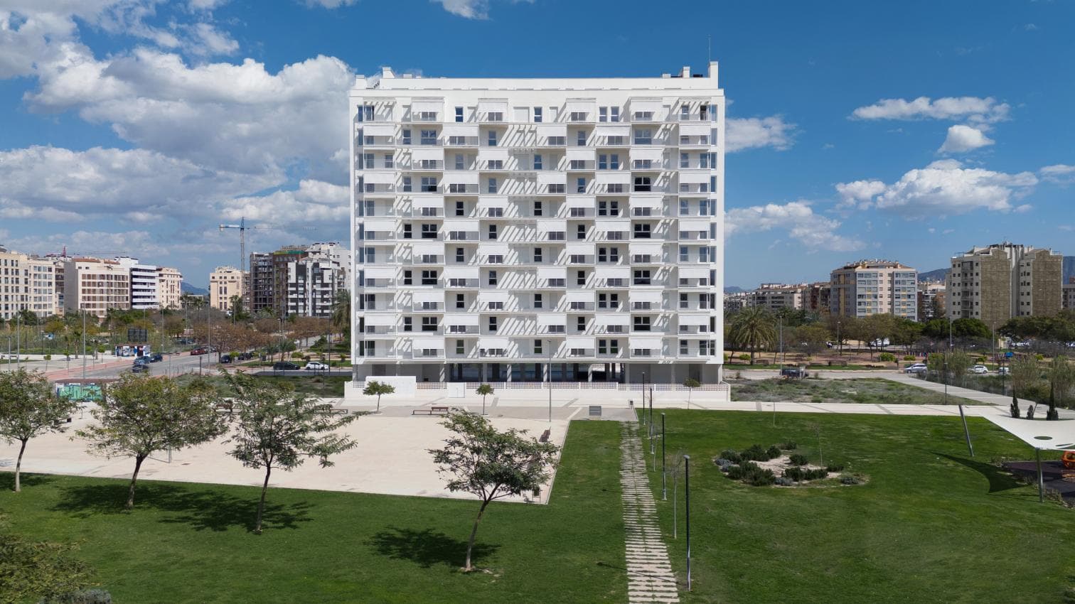 Situado en Santiago y Zaraíche, una pedanía del municipio de Murcia, este conjunto residencial de 138 viviendas destinadas al alquiler se desarrolla en un edificio de doce plantas más ático, asentado sobre las dos parcelas centrales de un conjunto lineal de cuatro. Esta disposición condiciona al edificio a contar únicamente con dos fachadas principales, orientadas al este y al oeste, una característica que se convierte en un eje fundamental del diseño arquitectónico.