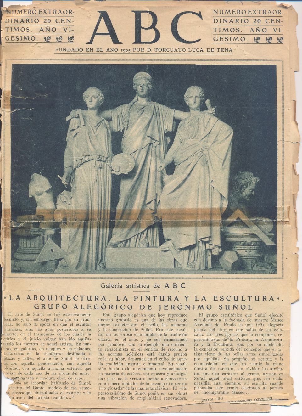 Pero el grupo escultórico de Salvatierra, en yeso, fue retirado y dio paso al de Jerónimo Suñol, “que ha de colocarse sobre el entablamento del pórtico de la entrada Norte del museo”, según las bases del concurso que demandaba que Pintura y Escultura, fueran abrazadas por la Arquitectura y esculpidas en piedra.