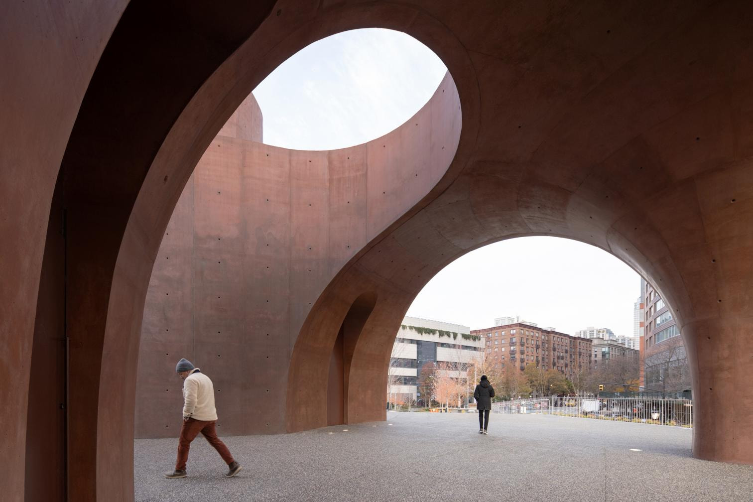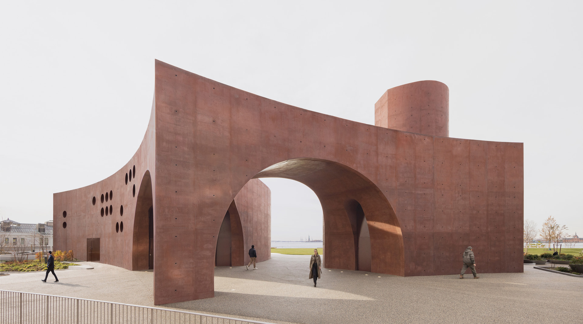 Thomas Phifer and Partners ha construido un pabellón de hormigón rojo para el recientemente finalizado parque Robert F. Wagner Jr., ubicado en Battery Park, en el extremo sur del Bajo Manhattan. El parque, diseñado por AECOM, incorpora estrategias para mejorar la resistencia frente a inundaciones. Tanto el pabellón como el parque forman parte de una ambiciosa transformación del frente costero, concebida para hacer frente a los desafíos del cambio climático y al aumento del nivel del mar.
