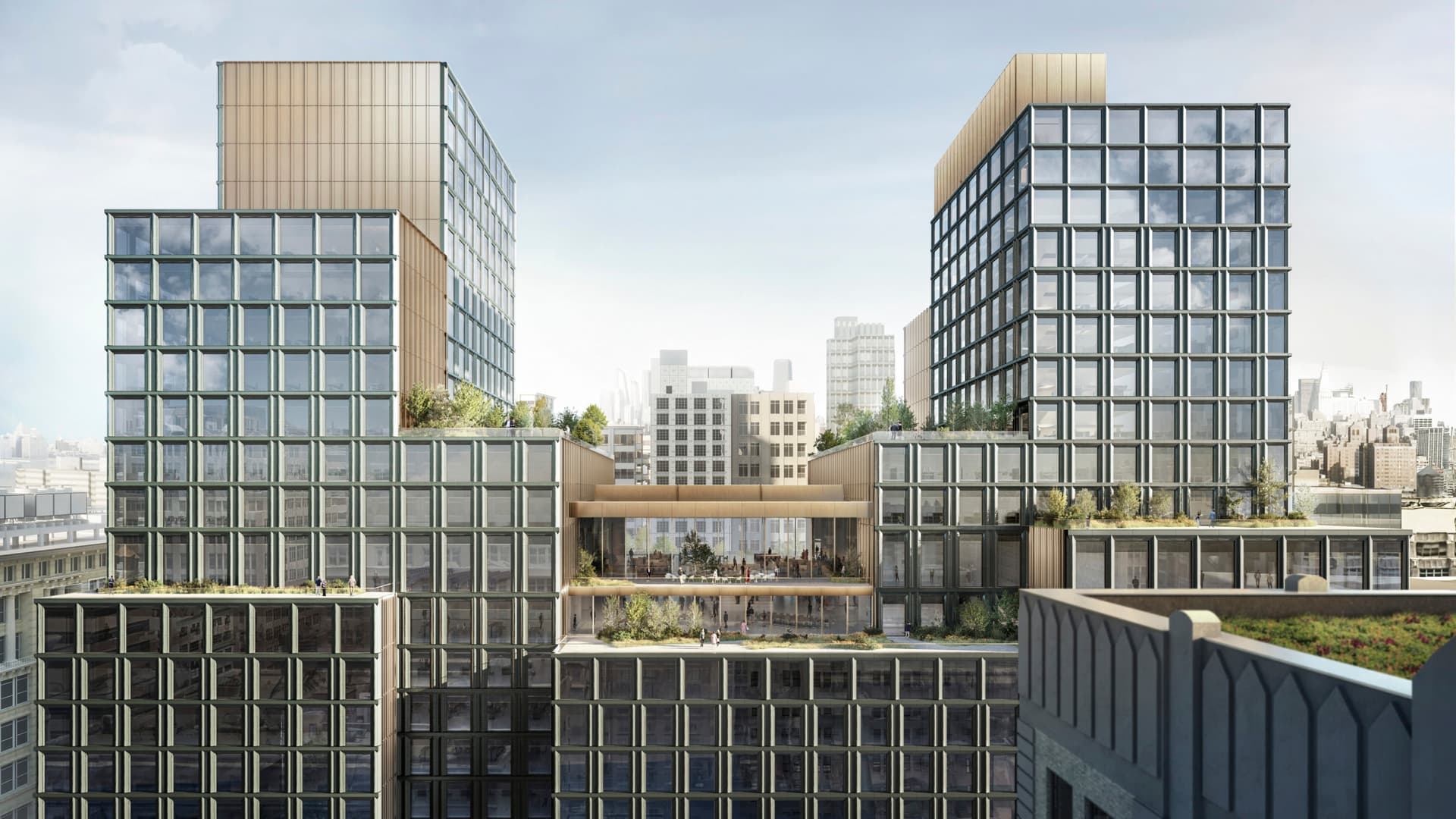 Adoptando un sentido de comunidad en el vecindario de uso mixto, el edificio será parte del tejido de Hudson Square con servicios comerciales a nivel del suelo. Arriba, el edificio original de 19 pisos se levantará en una serie de elegantes contratiempos, que culminarán en dos torres de 320 pies y varias terrazas que igualarán la escala de Hudson Square. A esta altura, el edificio brindará a los empleados vistas del río Hudson hacia el oeste y se conectará visualmente con las torres de agua y los techos de los almacenes que caracterizan al Bajo Manhattan.