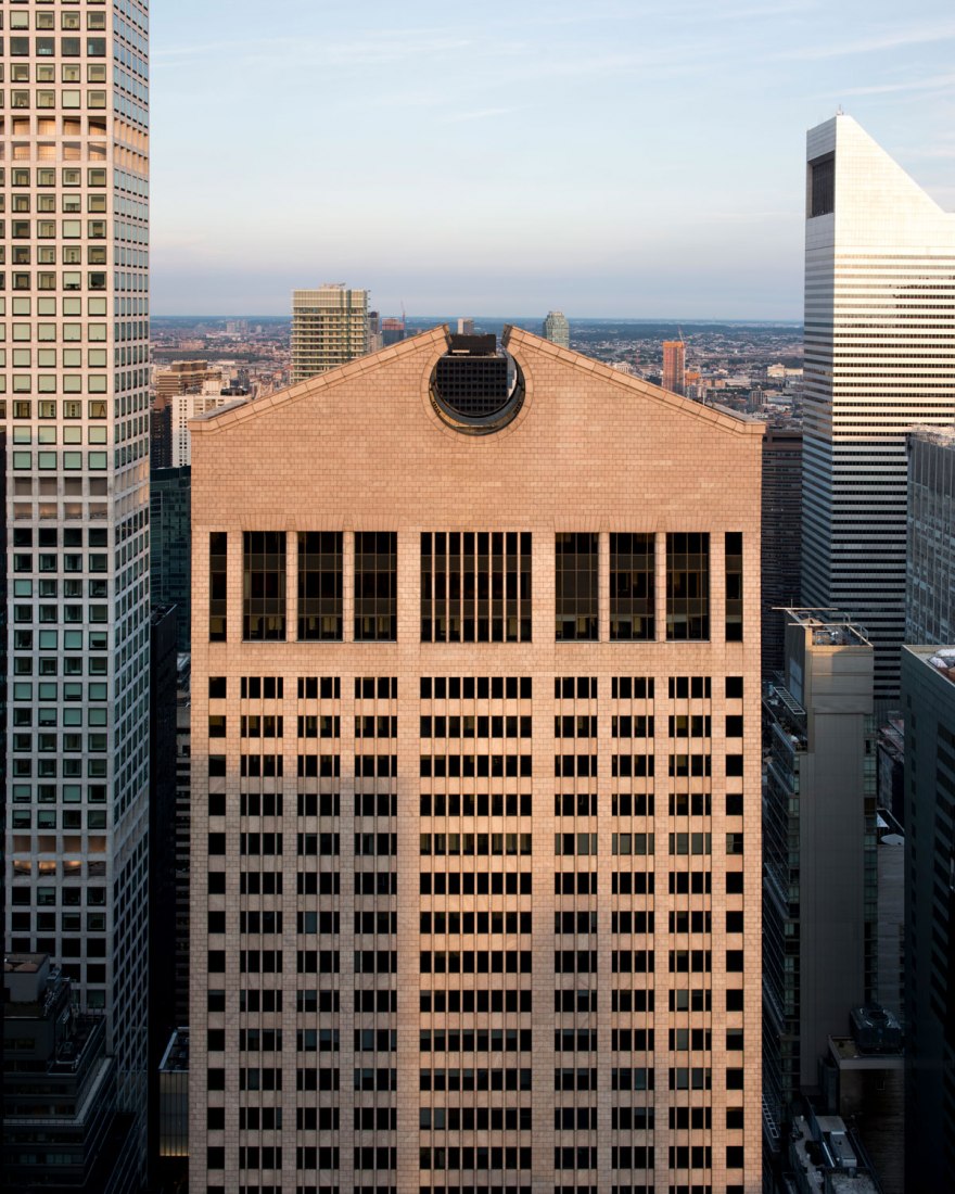 A mediados de la década de 1980, el camaleónico, provocador y cuestionable arquitecto Philip Johnson junto a John Burgee, inauguraron un rascacielos en el 550 de Madison Avenue, el edificio de AT&T, con una provocativa corona, su «frontón calado» , que rápidamente se hizo popular. Se convirtió en la imagen que consolidó la reinterpretación del lenguaje clásico como base de la posmodernidad arquitectónica.