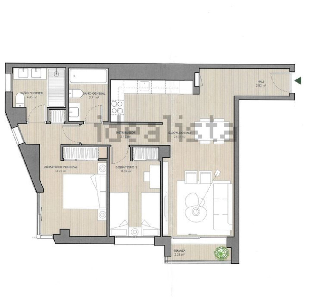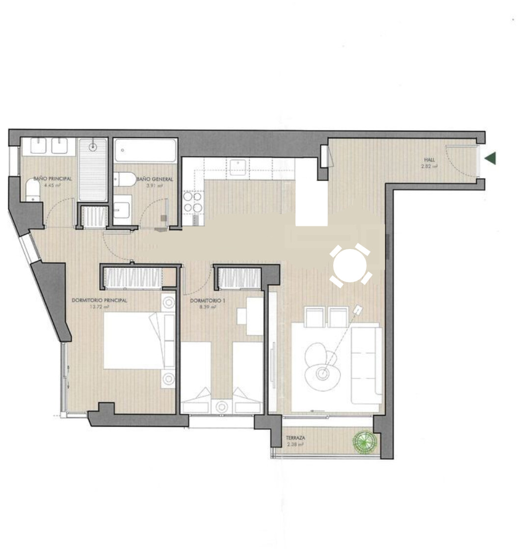 Distribución tristísima. Ya puestos a hacer cocina americana, yo habría quitado el tabique y en el ángulo inverso puesto una península. Por ejemplo.