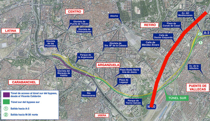 Cuando vienes por el nudo sur tendrias una salida hacia mendez alvaro y una entrada al tunel actual que sale en la A3
