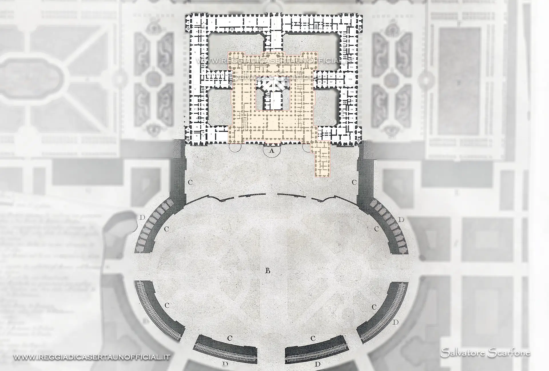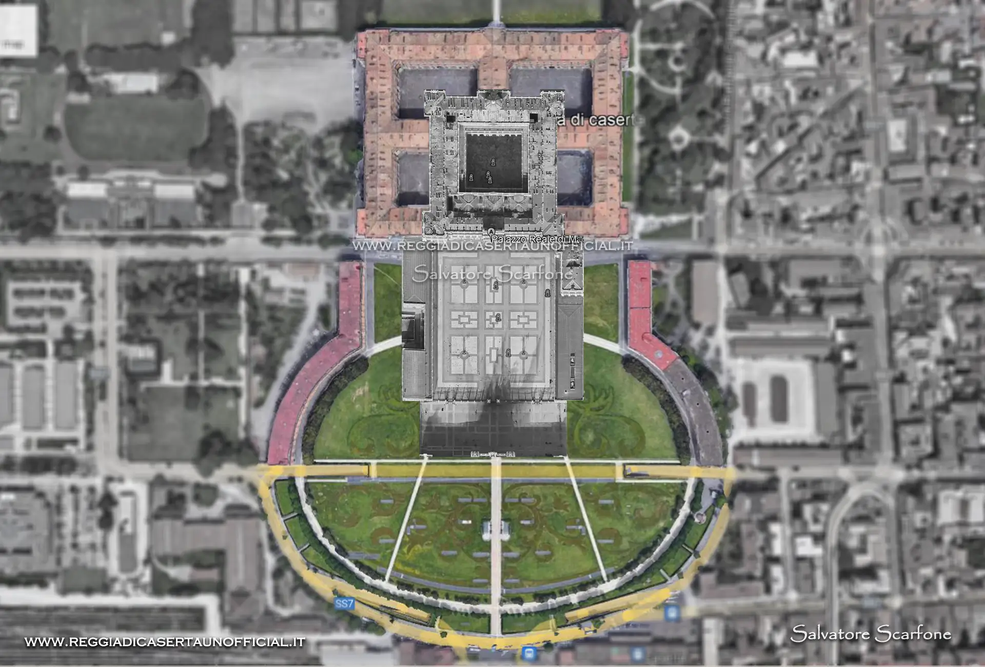 El palacio de Caserta es casi cuatro veces más grande que el madrileño. En cuanto a la altura y plantas es variable en el caso del edificio de Saquetti. Si se tiene en cuenta que en Caserta las cuatro fachadas tienen la misma altura se puede decir que el napolitano también es más alto. Aquí pongo varios fotomontajes donde se aprecia claramente las enormes dimensiones del palacio italiano comparado con Versalles y Madrid.