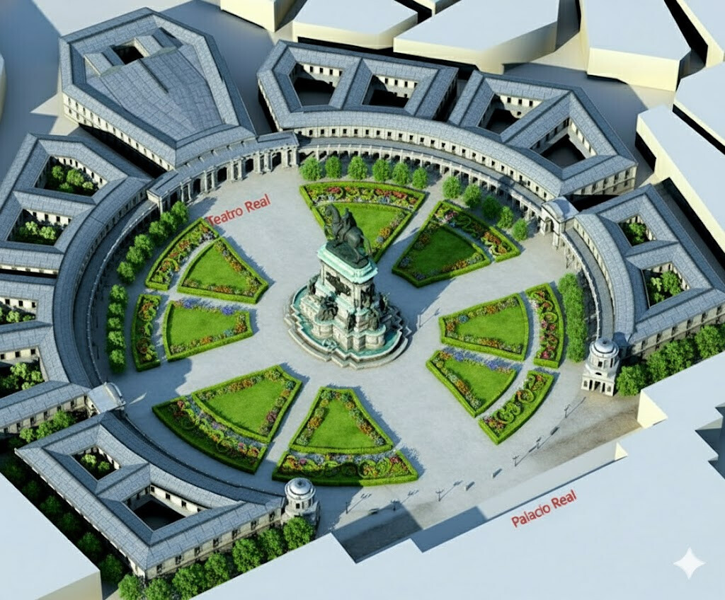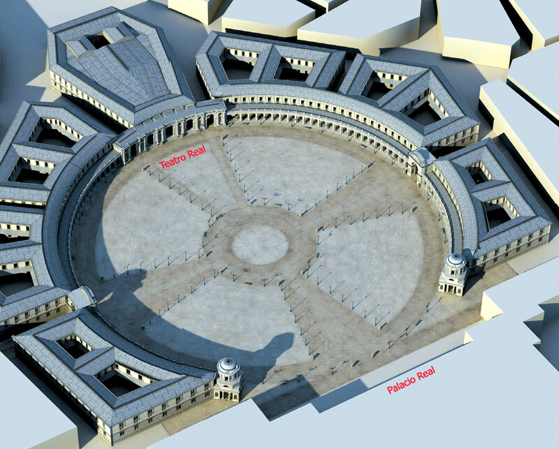 Sí pero lo que pasa es que al ser una plaza circular hubiera encajonado demasiado la vista del Palacio Real, a mí me parece mejor una plaza más abierta, pero diferente a la que tenemos ahora, que además está muy abandonada, llena de tierra y polvo. Tampoco los jardines de Lepanto y los de Cabo Noval me parece que formen una unidad coherente con el resto.