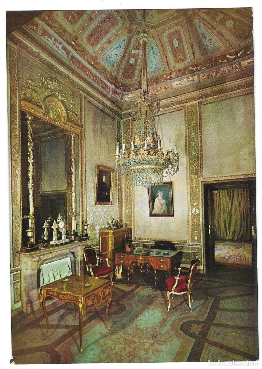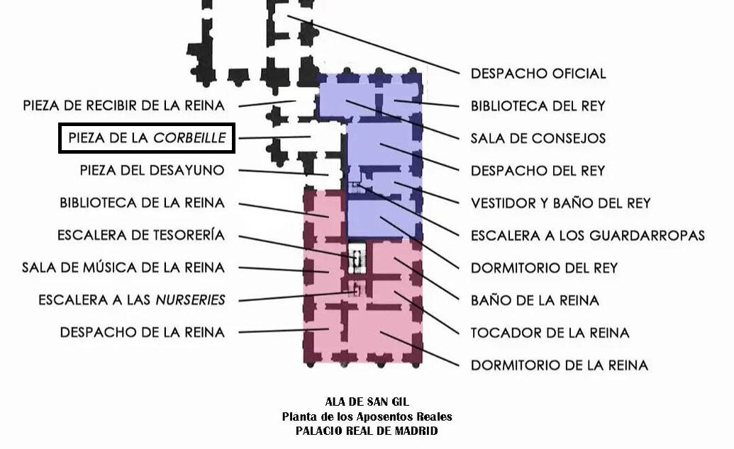 Comenzamos con el despacho habilitado para el Rey Felipe VI, se sitúa en las dependencias del ala de San Gil, concretamente en la pieza de la Corbeille. Actualmente, se utiliza únicamente para recibir a embajadores en la ceremonia de entrega de cartas credenciales.