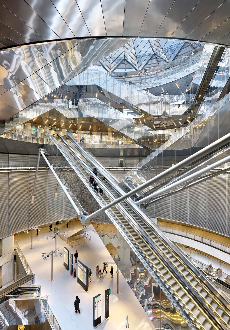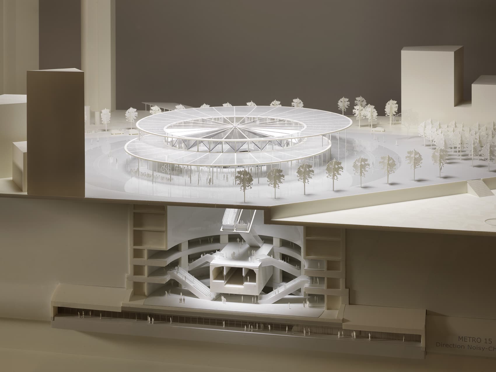 La estación de Villejuif - Gustave Roussy, una de las estaciones emblemáticas del Grand Paris Express, que atenderá a más de 100.000 pasajeros al día, presenta una arquitectura helicoidal que ejerce una fuerza centrípeta desde el tejido urbano, a través de un gran cilindro de hormigón inundado de luz, que es atravesado y animado por pasarelas y escaleras mecánicas, atrayendo la vida, el cielo y la gente hacia el espacio que se ha completado bajo tierra situado a unos cincuenta metros de profundidad.