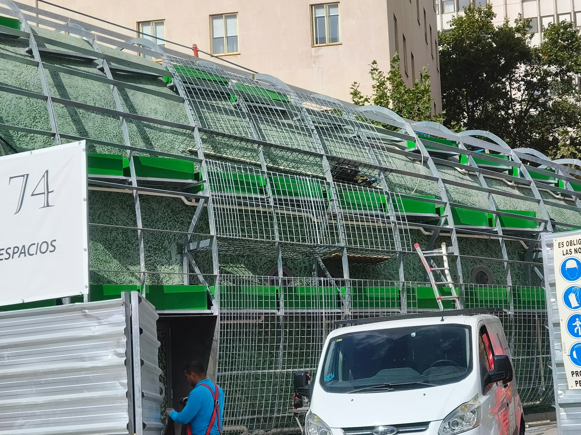 Lo que observamos es una estructura secundaria de metal, probablemente acero galvanizado o aluminio, que actúa como un “exoesqueleto” sobre el edificio original de la cafetería. Sobre esta estructura se anclan los componentes de la fachada vegetal.