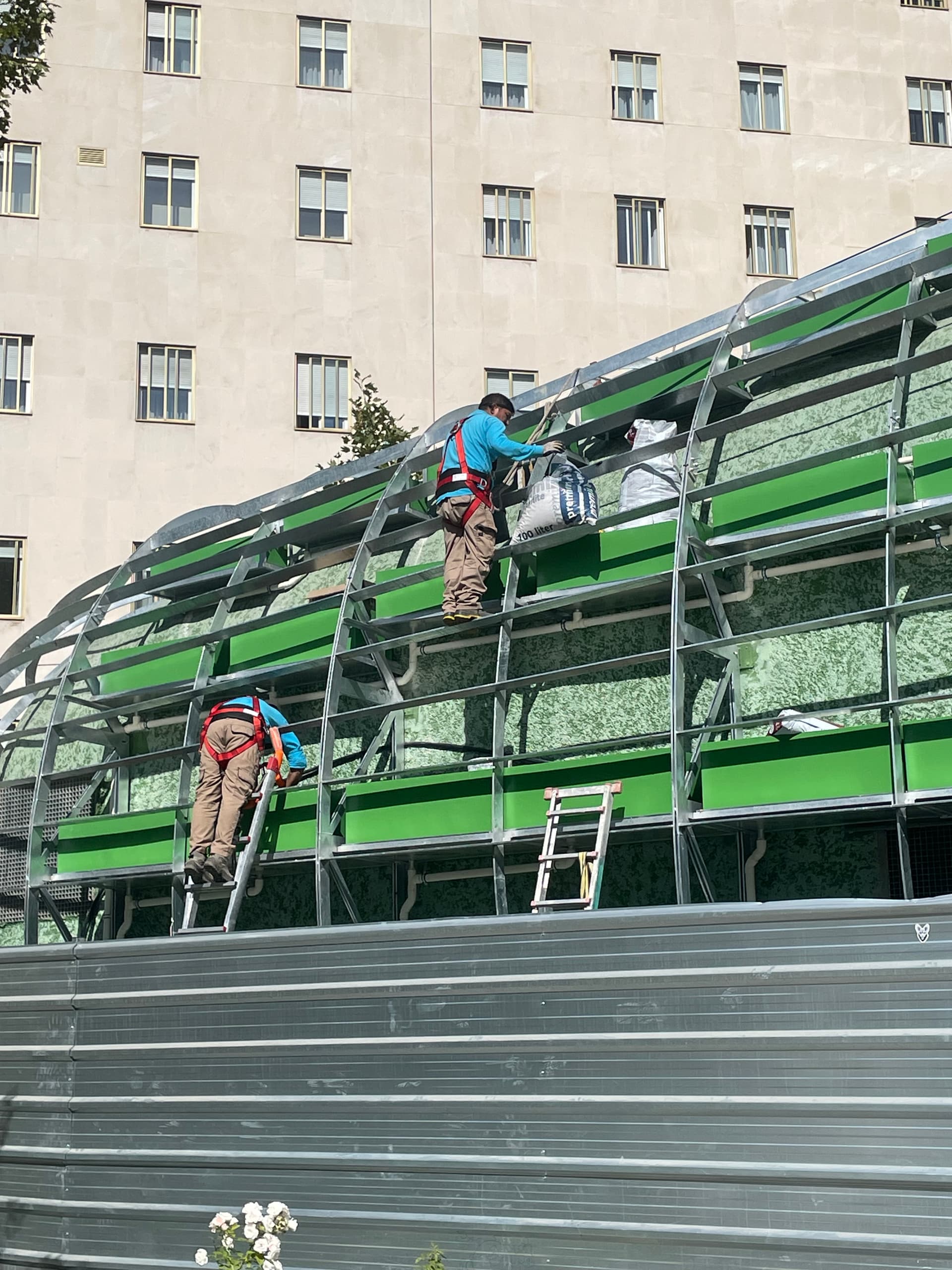 Sustrato Técnico: Los operarios están rellenando los módulos con sacos de lo que sin duda es un sustrato técnico ligero. No es tierra común, sino una mezcla diseñada para ser poco pesada, con alta capacidad de retención de agua y nutrientes, y que no se compacte con el tiempo.