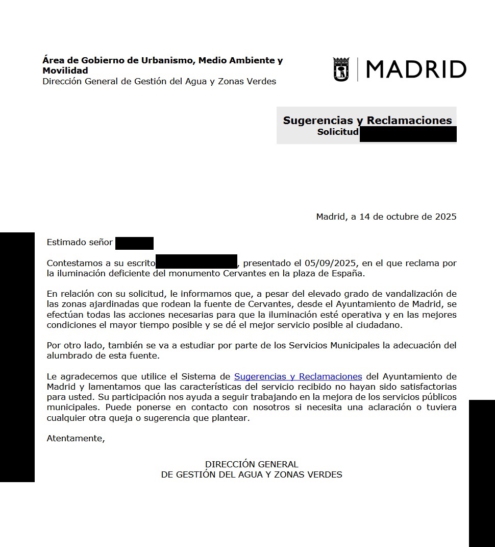 Respuesta tras una reclamación sobre la iluminación del monumento Cervantes.