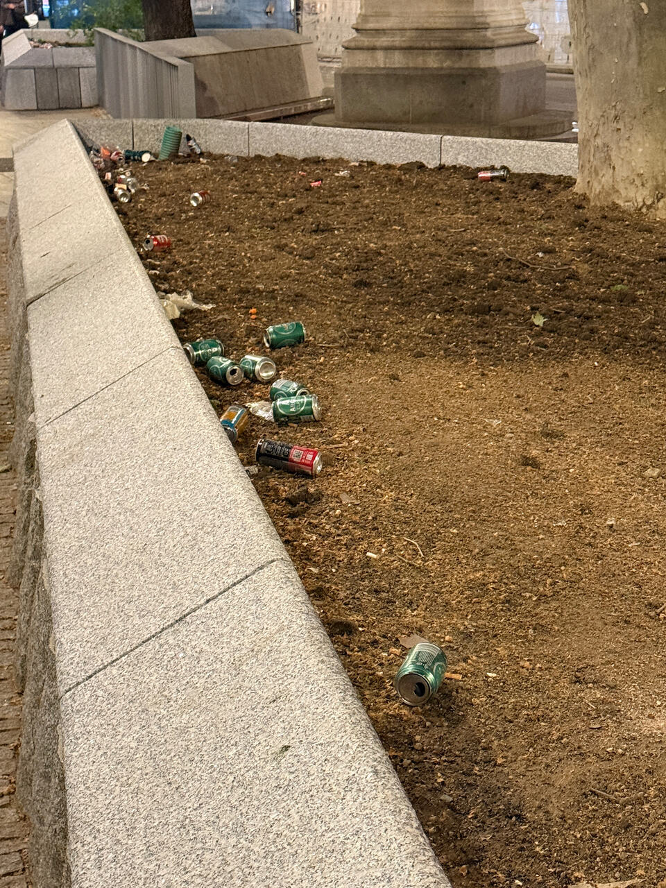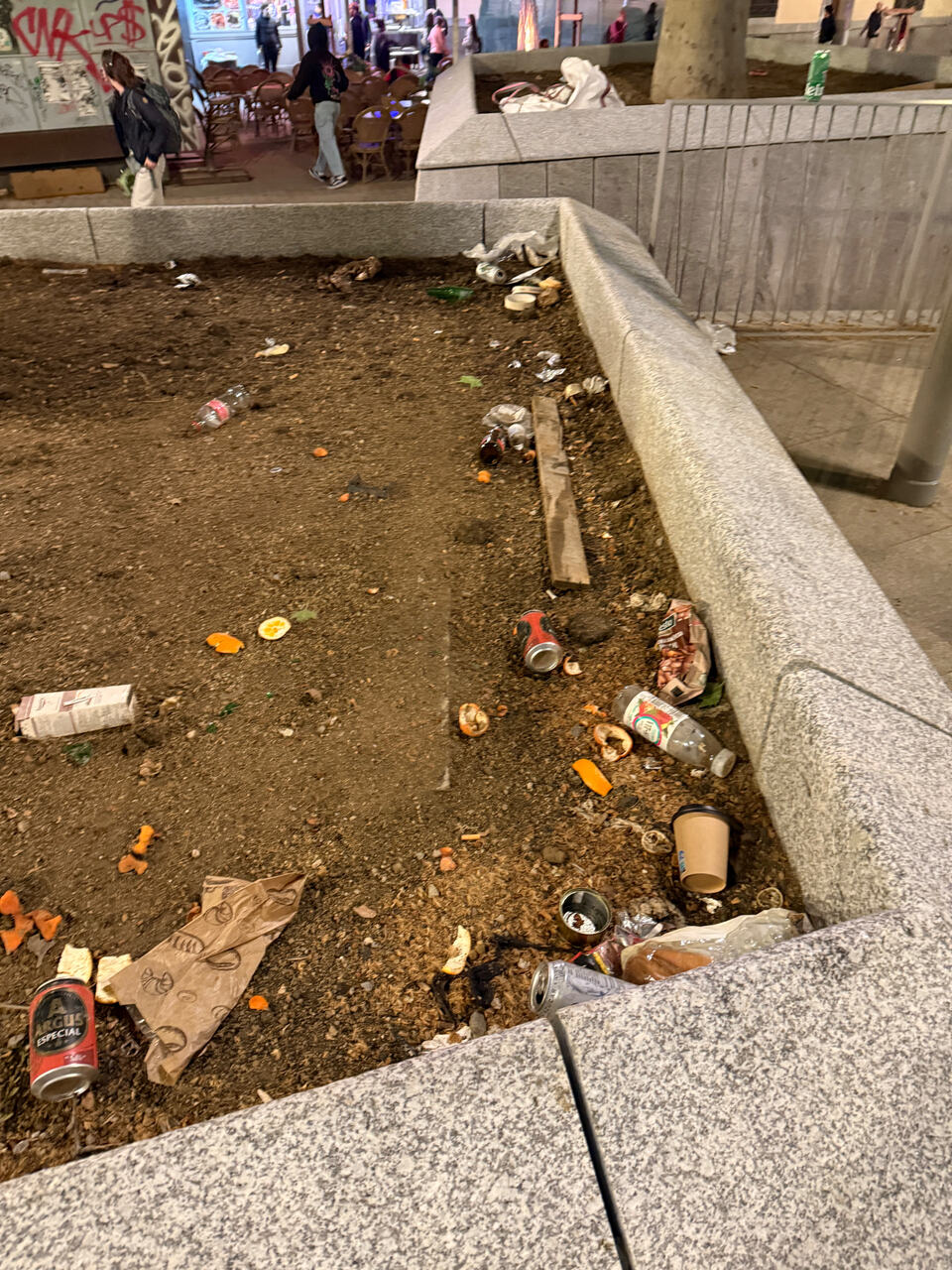 Esa acumulación de basura viene de un grupo que ha estado un rato sentado en esas estructuras, no de viandantes que disimuladamente dejan caer cosas en el suelo sin apenas ser vistos. Es una zona con cámaras con lo que el Ayuntamiento puede identificar a los infractores y multar les.