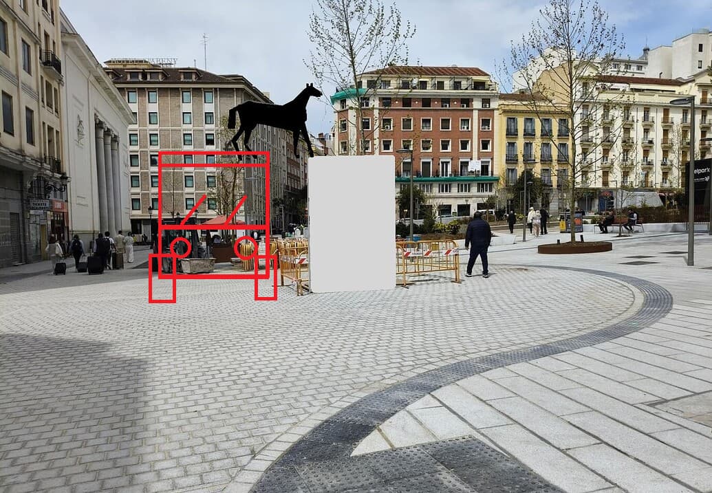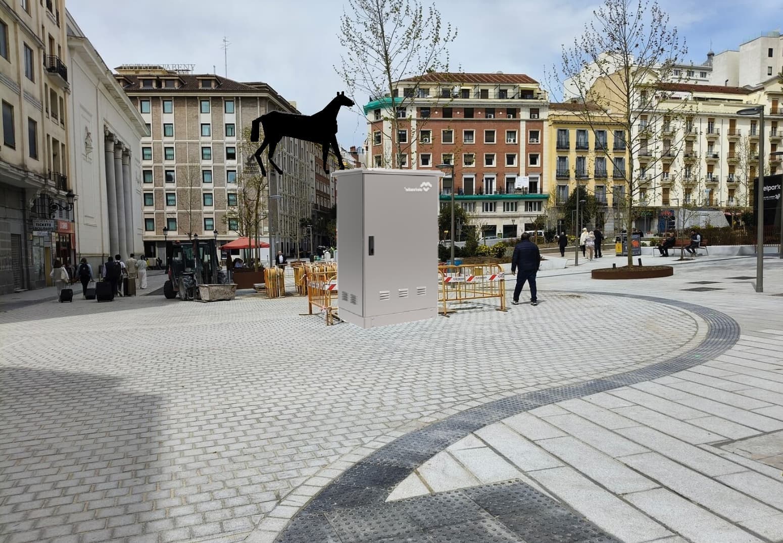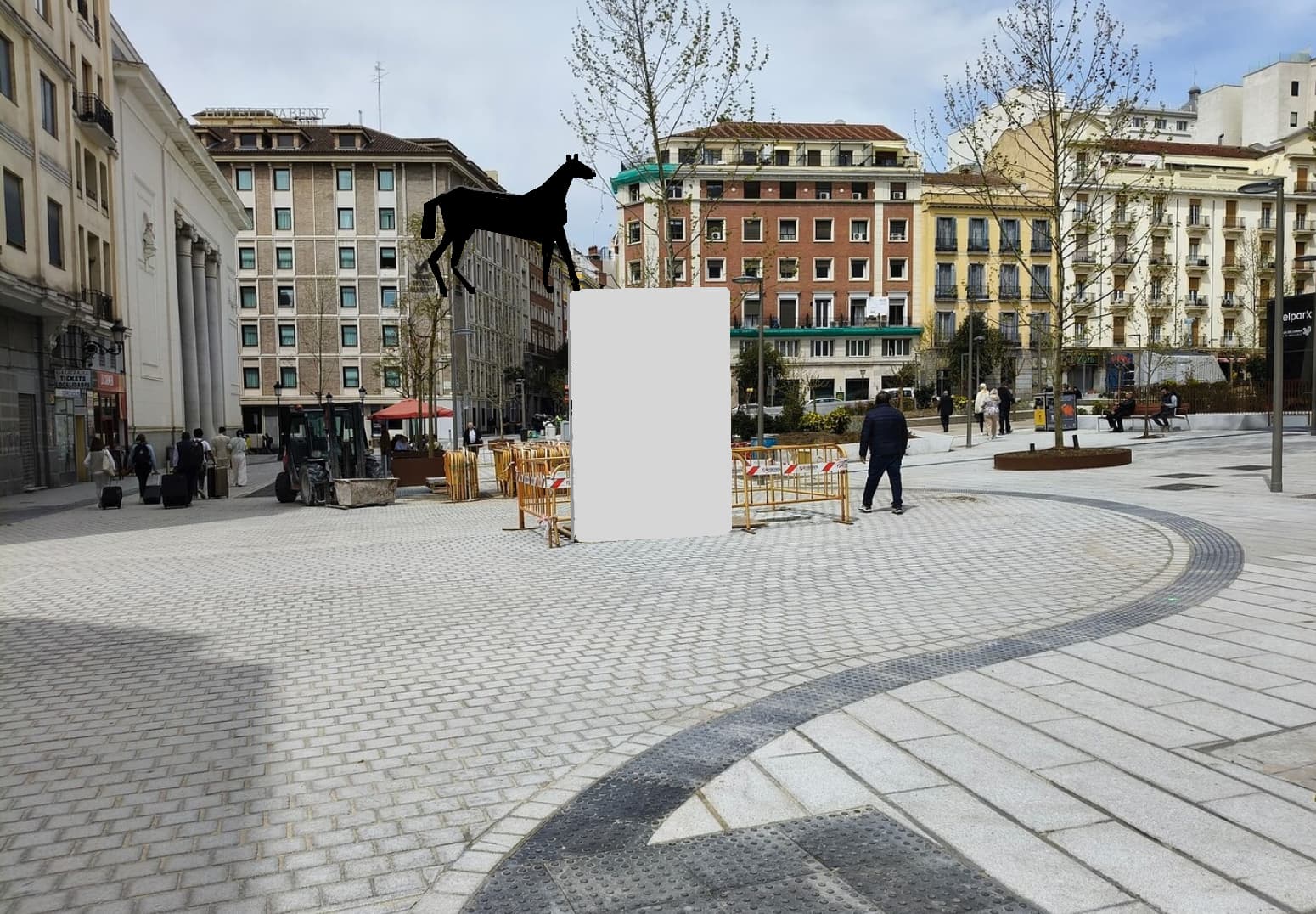 Sí, ya, se puede decir que entonces, mejor no poner nada, pero si fuese tal y como aparece en la imagen, veo la escultura toda una tentación. Más que robar, veo que el problema sería que el gañán de turno querría retratarse subido a lomos del caballo. Un bonito recuerdo para algunos madrileños, pero sobre todo para visitantes de nuestra ciudad que antes se hayan puesto a tono en las terrazas vecinas.