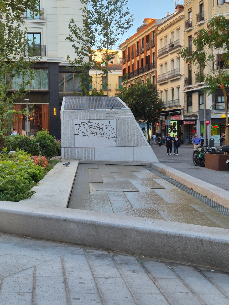 Sinceramente, está mal diseñada, eso estaba pidiendo a gritos grafitis, primero porquees literalmente un lienzo en balanco, liso, granítico, perfecto para mierdas de tags; segundo, porque la obra en si no tiene nada d ebonita y les dará menos reparo (ya sé que se atreven con todo, pero con lo feo da menos reparo). Alguna cámara habrá, y si no la hya, quizás es hora de poner cámaras ocultas y crujirles a multas. Que trabajen de una maldita vez que están a escasos segundos de una comisaría.